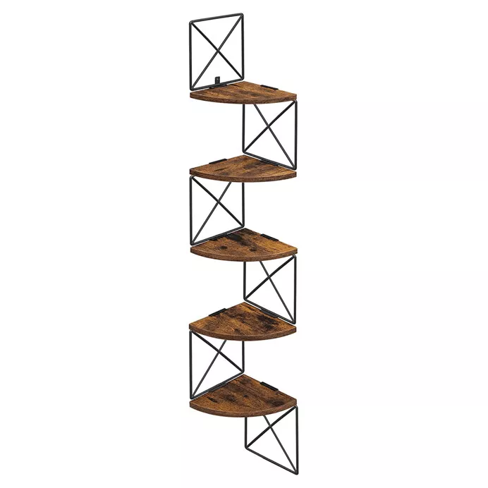Nástěnná rohová police v dekoru old wood propojuje teplé hnědé tóny MDF desek s černým kovovým rámem, který zajišťuje stabilitu a dodává policím výrazný industriální charakter. Konstrukci tvoří pět segmentů ve tvaru čtvrtkruhu, vzájemně propojených kovovými prvky s křížovým vzorem ? celek působí pevně a zároveň vzdušně.