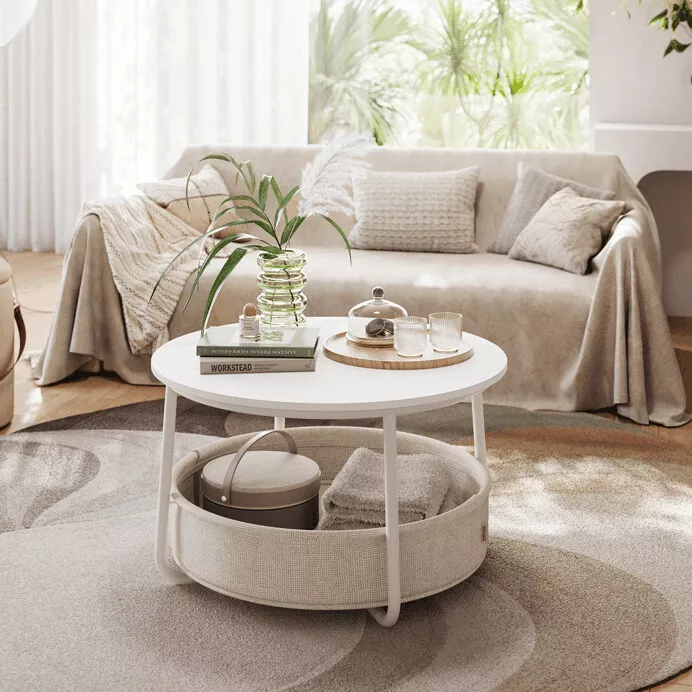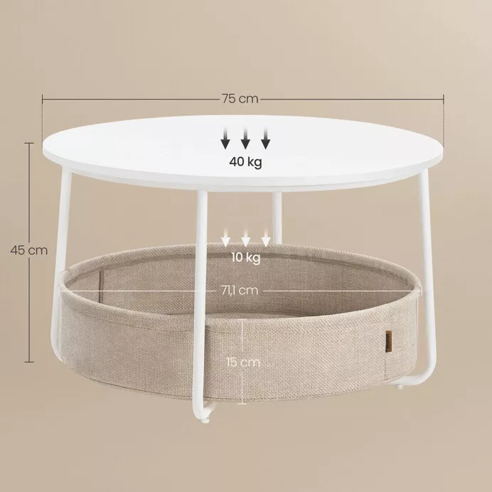 Moderní konferenční stolek AFK-E1144 WT v kulatém provedení kombinuje čistý design s praktickou funkčností. Pod bílou MDF deskou se nachází textilní úložný koš, který poskytne prostor pro deky, časopisy nebo drobnosti, a zároveň zútulní interiér svým přírodním odstínem. Stabilní kovové nohy v bílé barvě zajišťují pevnost a vizuální lehkost celku. Ideální volba do moderních obývacích pokojů.