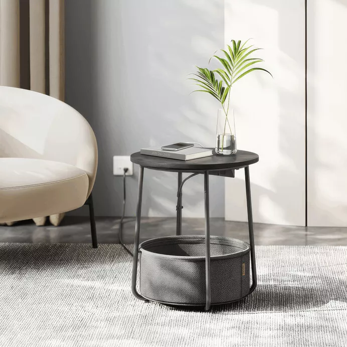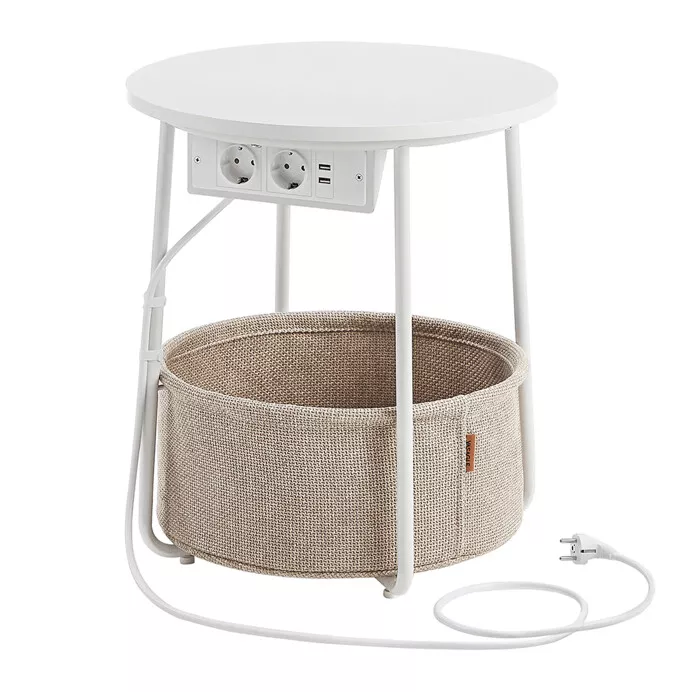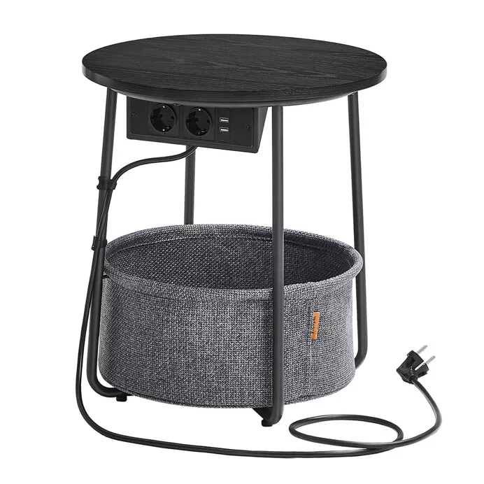 Moderní odkládací stolek s chytrými funkcemi je praktickým doplňkem do obývacího pokoje i pracovny. Kulatá MDF deska v černém dekoru působí elegantně a snadno zapadne do různých interiérů. Kovové nohy zajišťují stabilitu, zatímco textilní koš pod deskou poskytuje nenápadný úložný prostor pro drobnosti. Velkou výhodou je integrovaná elektrická zásuvka se dvěma výstupy a dvěma USB porty, díky nimž pohodlně nabijete elektroniku přímo u stolku. Napájecí kabel je veden po rámu, což pomáhá udržet pořádek.