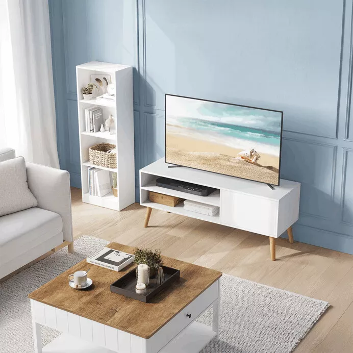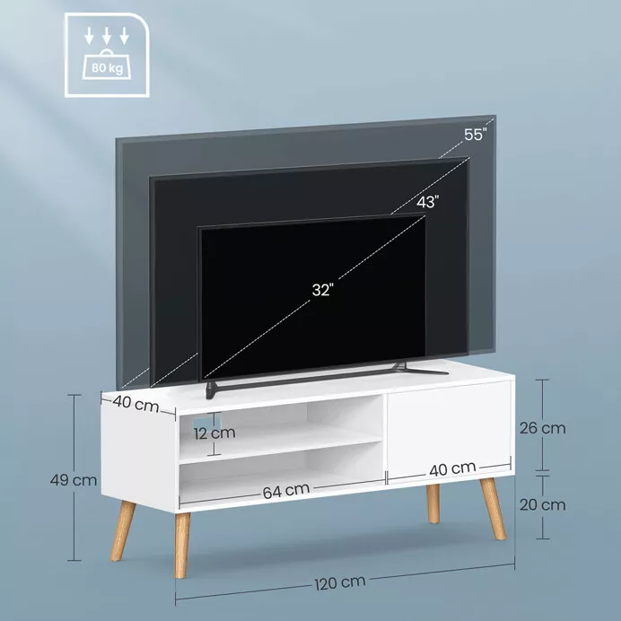 Moderní televizní stolek v jednoduchém a nadčasovém provedení nabízí praktické řešení pro umístění TV i přehledné uspořádání elektroniky. Korpus z bílé MDF desky působí čistě a svěže, snadno se udržuje a dobře zapadne do různých interiérů. Nohy z masivního kaučukového dřeva zajišťují stabilitu a zároveň dodávají stolku přírodní akcent.