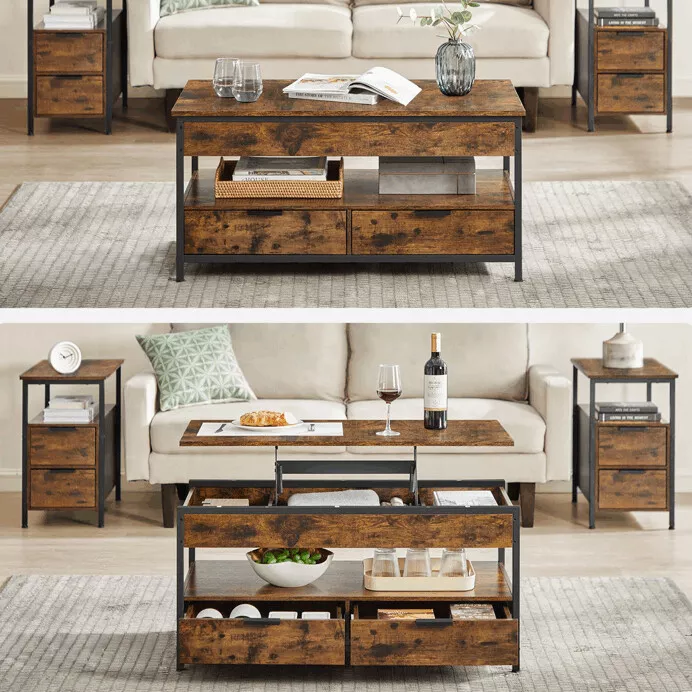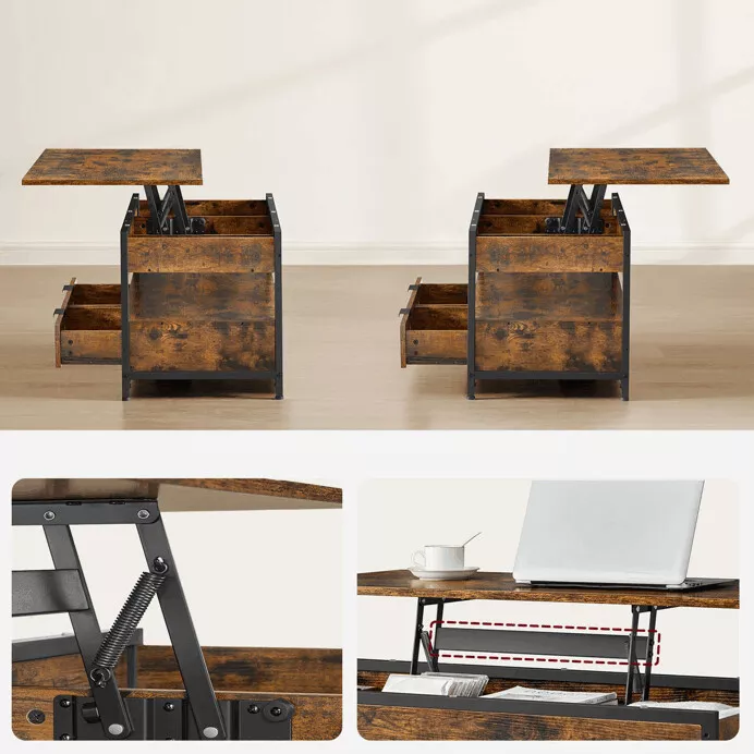 Hlavní předností stolku je výklopná horní deska s nastavitelnou výškou (48-63 cm), pod kterou se nachází prostorný úložný prostor ideální pro uložení časopisů, ovladačů nebo drobností, které chcete mít po ruce, ale ne na očích. Funkčnost dále rozšiřují dvě spodní zásuvky s kovovými úchytkami, vhodné pro přehlednou organizaci menších předmětů.