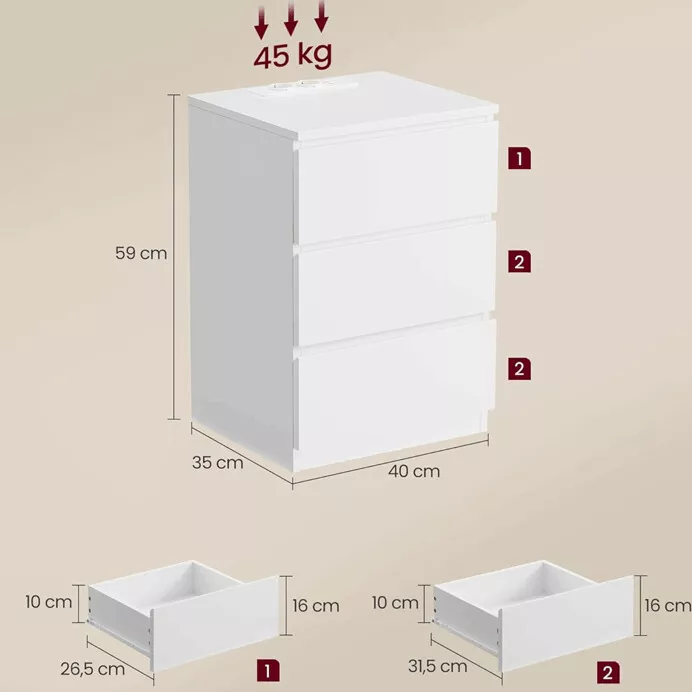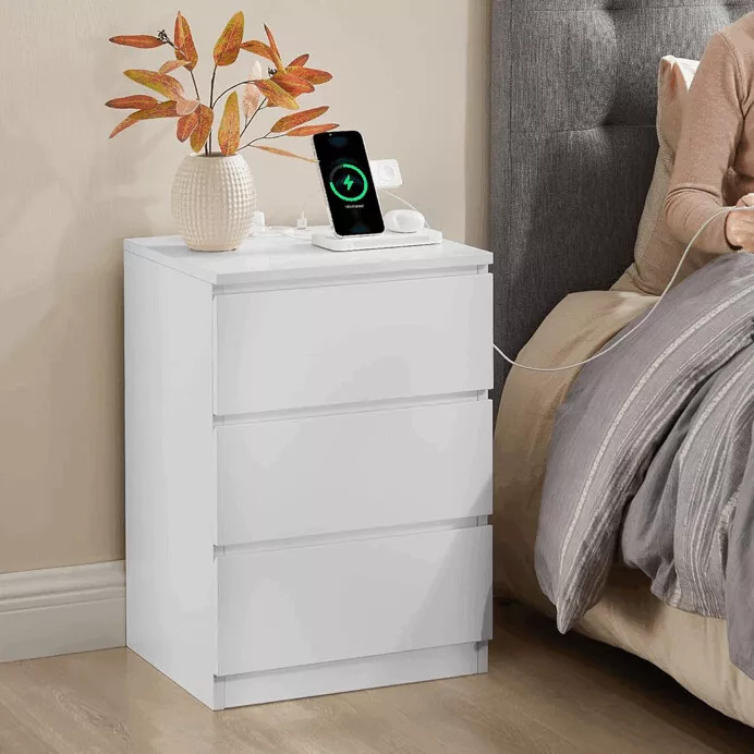 Praktický a elegantní noční stolek, který spojuje čistý moderní design s chytrými funkcemi pro každodenní pohodlí. Hladké bílé provedení snadno zapadne do jakékoliv ložnice a díky třem zásuvkám s tichým dojezdem budete mít všechny drobnosti vždy přehledně po ruce. Velkým benefitem je integrovaná elektrická zásuvka a USB port na horní desce ? ideální pro nabíjení telefonu či jiných zařízení přímo u postele.