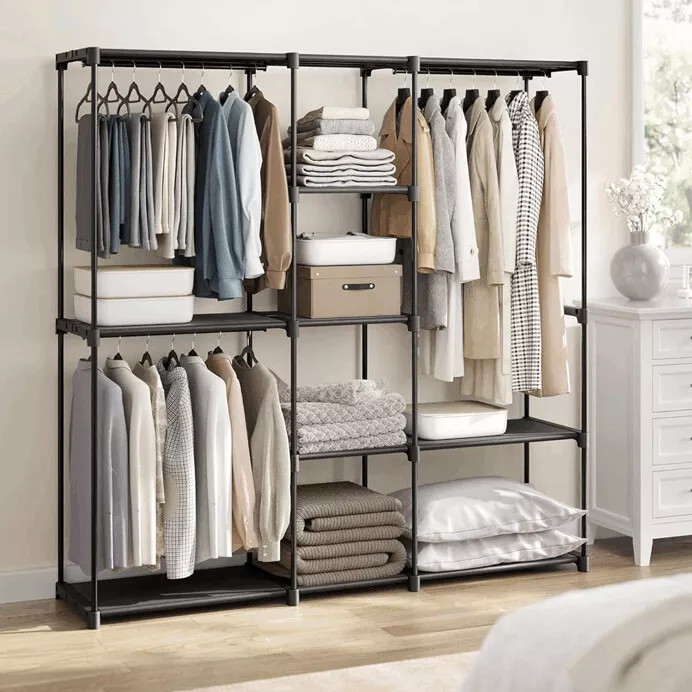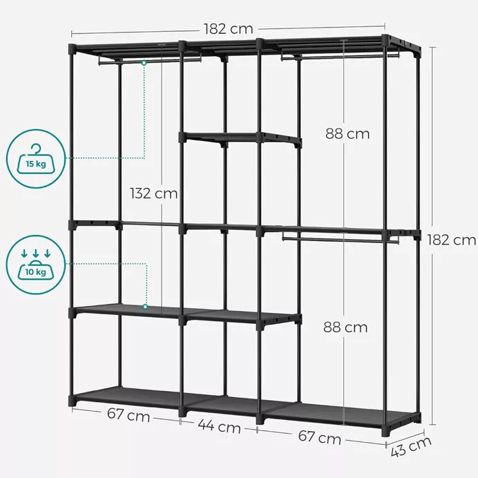 Praktická otevřená šatní skříň v moderním černém provedení nabízí přehledné a snadno dostupné úložné řešení pro oblečení i doplňky. Pevná kovová konstrukce zajišťuje stabilitu a dlouhou životnost, zatímco otevřený design umožňuje rychlý přístup k uloženým věcem a vzdušné uspořádání prostoru.