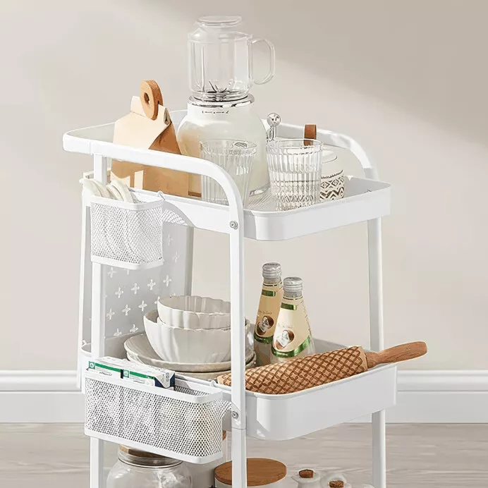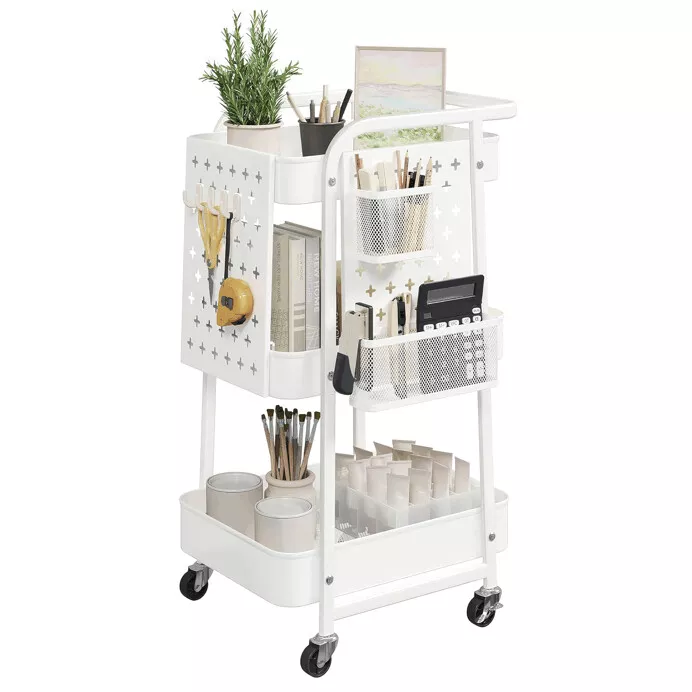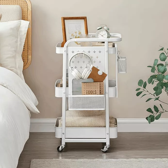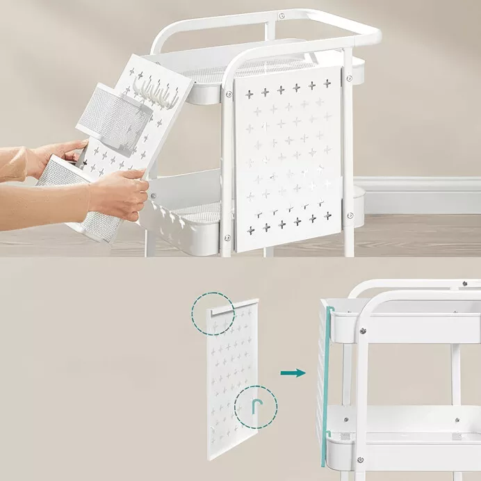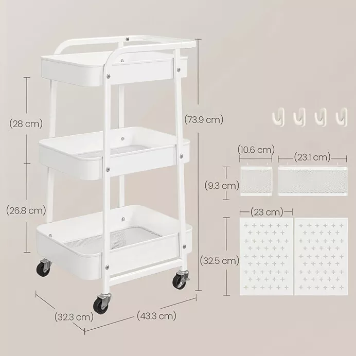 Vozík disponuje třemi prostornými policemi a perforovanými bočními panely, které umožňují doplnění košíků či háčků a přehlednou organizaci drobností. Čtyři otočná kolečka, z toho dvě s brzdou, zajišťují snadnou manipulaci i bezpečné zajištění na místě. Díky kompaktním rozměrům se hodí i do menších prostor.