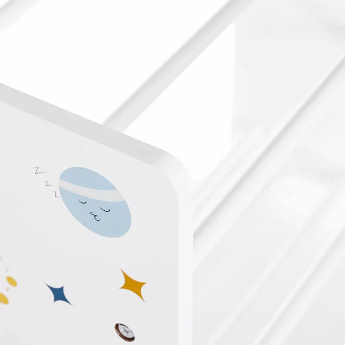 Praktický regál na hračky s látkovými boxy pomůže udržet dětský pokoj přehledný a uklizený, a zároveň jej oživí hravým designem. Bílé bočnice jsou doplněny barevným motivem vesmíru, který podporuje dětskou fantazii a dělá z regálu nejen úložný prostor, ale i hezký doplněk pokoje.