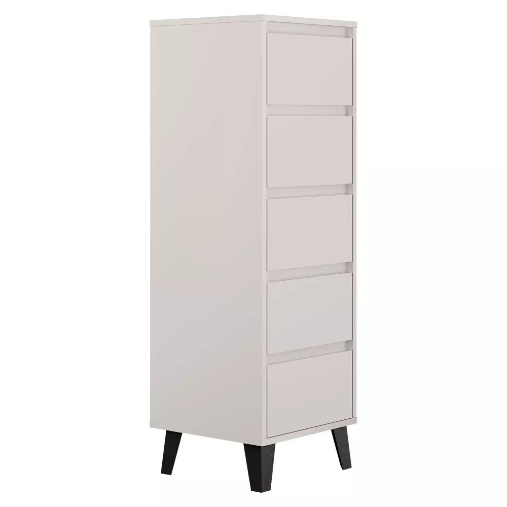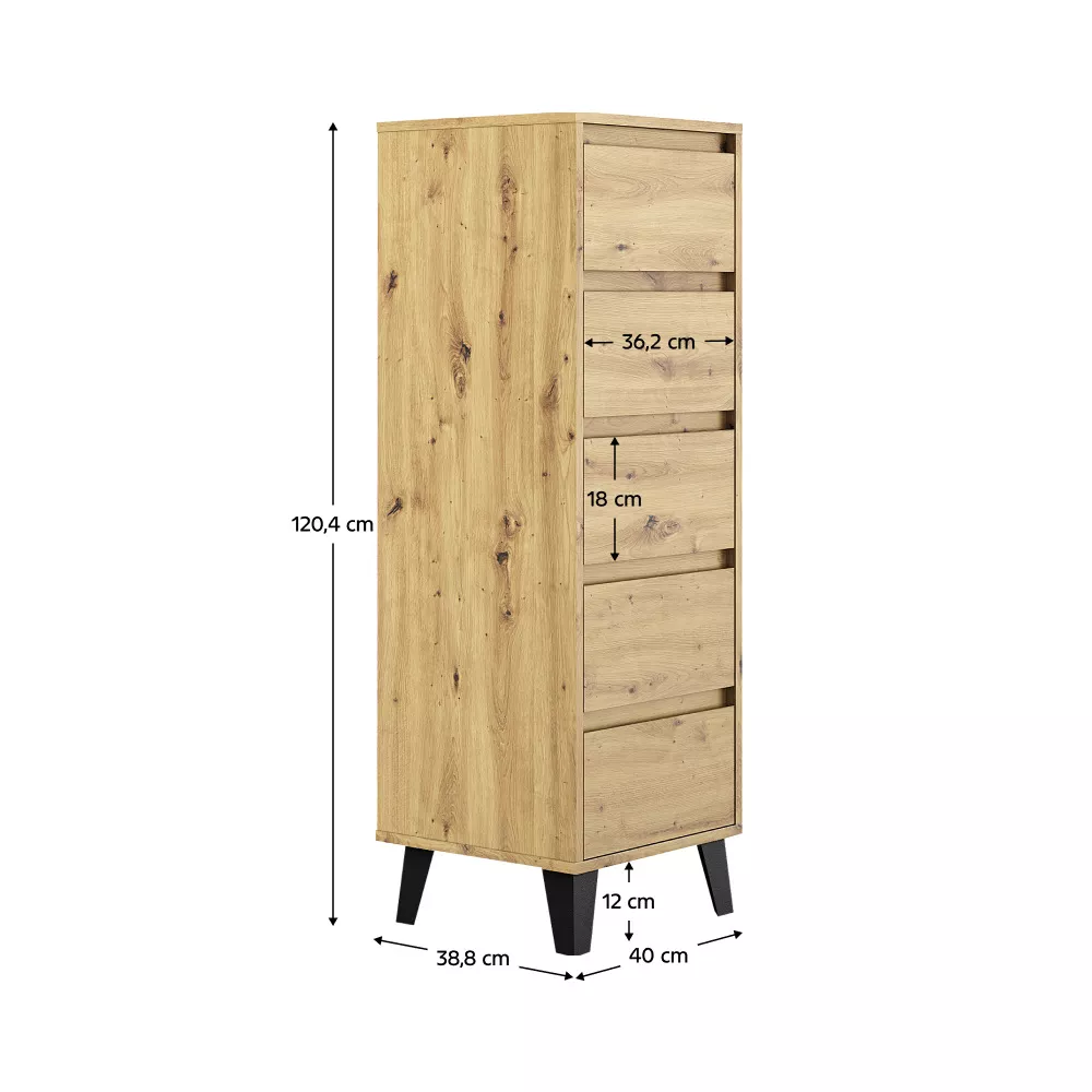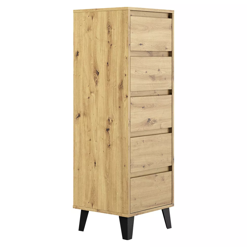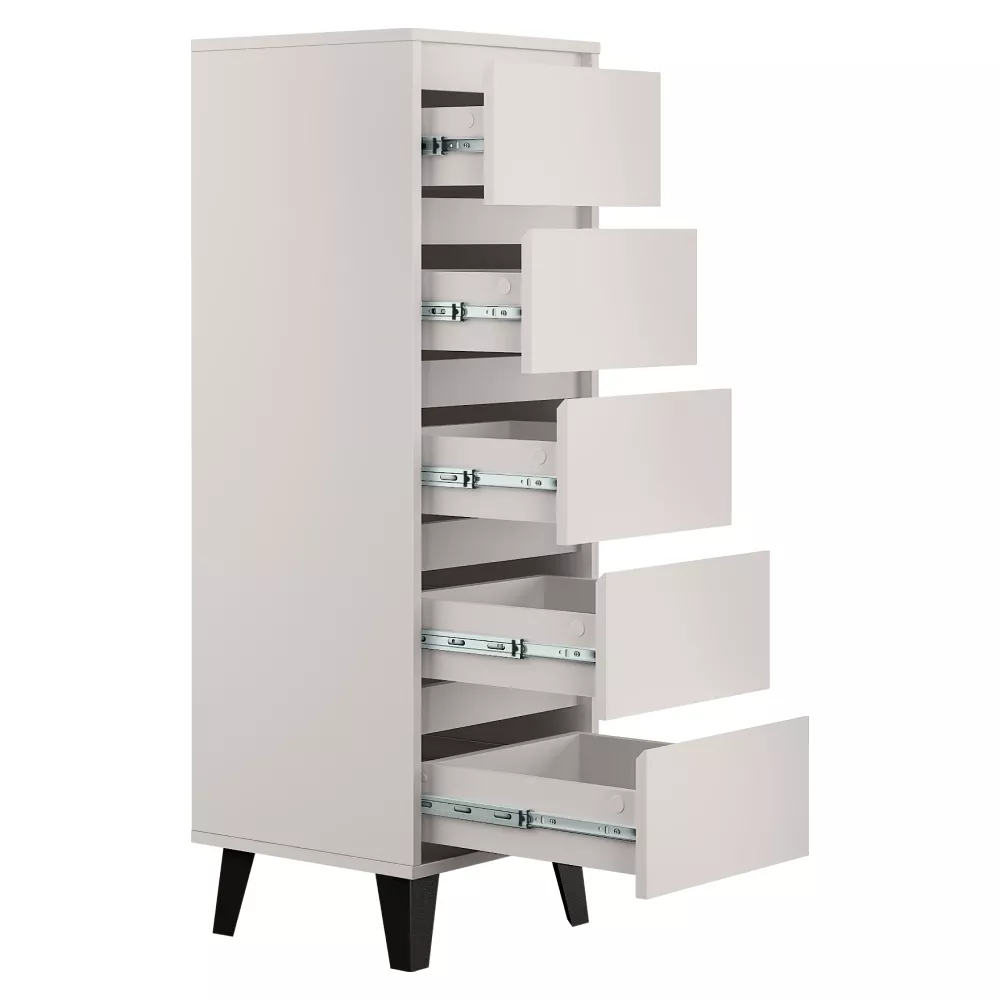 Komoda BOGAN NEW 5S40 je praktickým a elegantním úložným řešením pro moderní interiéry, kde je potřeba maximálně využít prostor bez kompromisů na vzhledu. Díky svému úzkému a vyššímu provedení se skvěle hodí do obývacích pokojů, ložnic, předsíní i studentských či dětských pokojů. Nadčasový odstín kašmír v kombinaci s černými nožičkami působí lehce a současně dodává komodě výrazný moderní charakter. Pět prostorných zásuvek bez úchytek se otevírá pomocí zafrézovaných žlábků a poskytuje přehledný úložný prostor pro oblečení, dokumenty i drobnosti každodenního použití.