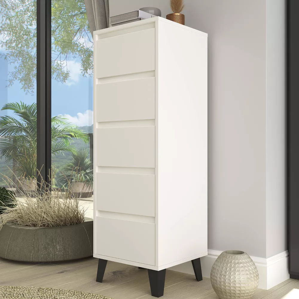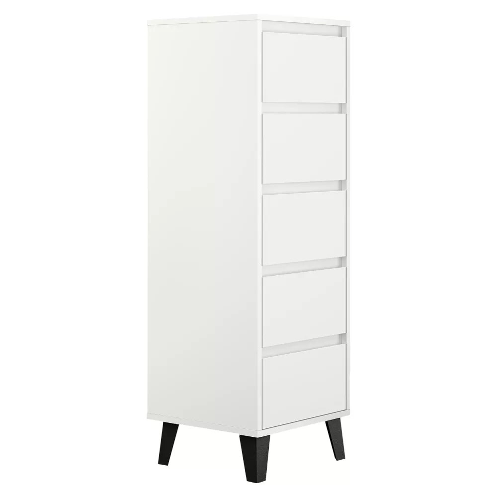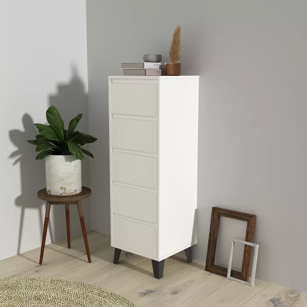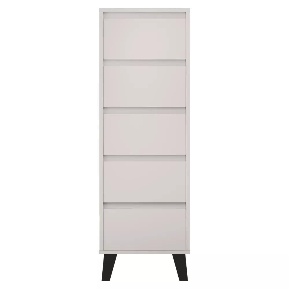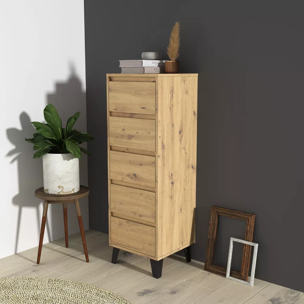 Komoda BOGAN NEW 5S40 je praktickým a elegantním úložným řešením pro moderní interiéry, kde je potřeba maximálně využít prostor bez kompromisů na vzhledu. Díky svému úzkému a vyššímu provedení se skvěle hodí do obývacích pokojů, ložnic, předsíní i studentských či dětských pokojů. Nadčasový odstín kašmír v kombinaci s černými nožičkami působí lehce a současně dodává komodě výrazný moderní charakter. Pět prostorných zásuvek bez úchytek se otevírá pomocí zafrézovaných žlábků a poskytuje přehledný úložný prostor pro oblečení, dokumenty i drobnosti každodenního použití.