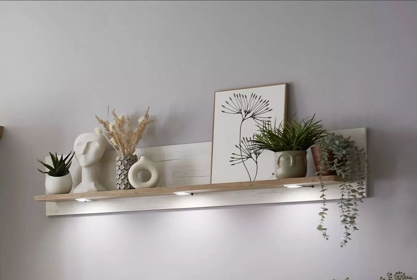 Závěsný panel s policí Amram Typ 41 je praktický doplněk do obývacího pokoje, předsíně i ložnice, kde vytvoří místo pro dekorace, drobnosti nebo věci, které chcete mít po ruce. Díky montáži na stěnu působí vzdušně a šetří prostor, zároveň ladí s ostatním nábytkem ve stejném dekoru.