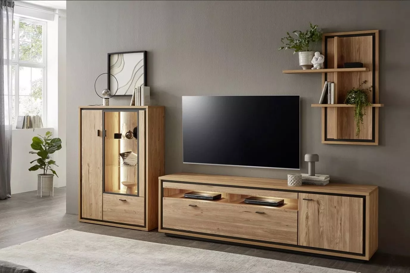 Moderní obývací sestava Bali Plus Typ 02, která kombinuje vitrínu, skříňku pod TV a policový panel do jednoho funkčního celku. Nabízí dostatek úložného prostoru, místo pro elektroniku i prostor pro dekorace, díky čemuž pomůže udržet obývací pokoj přehledný a sladěný.