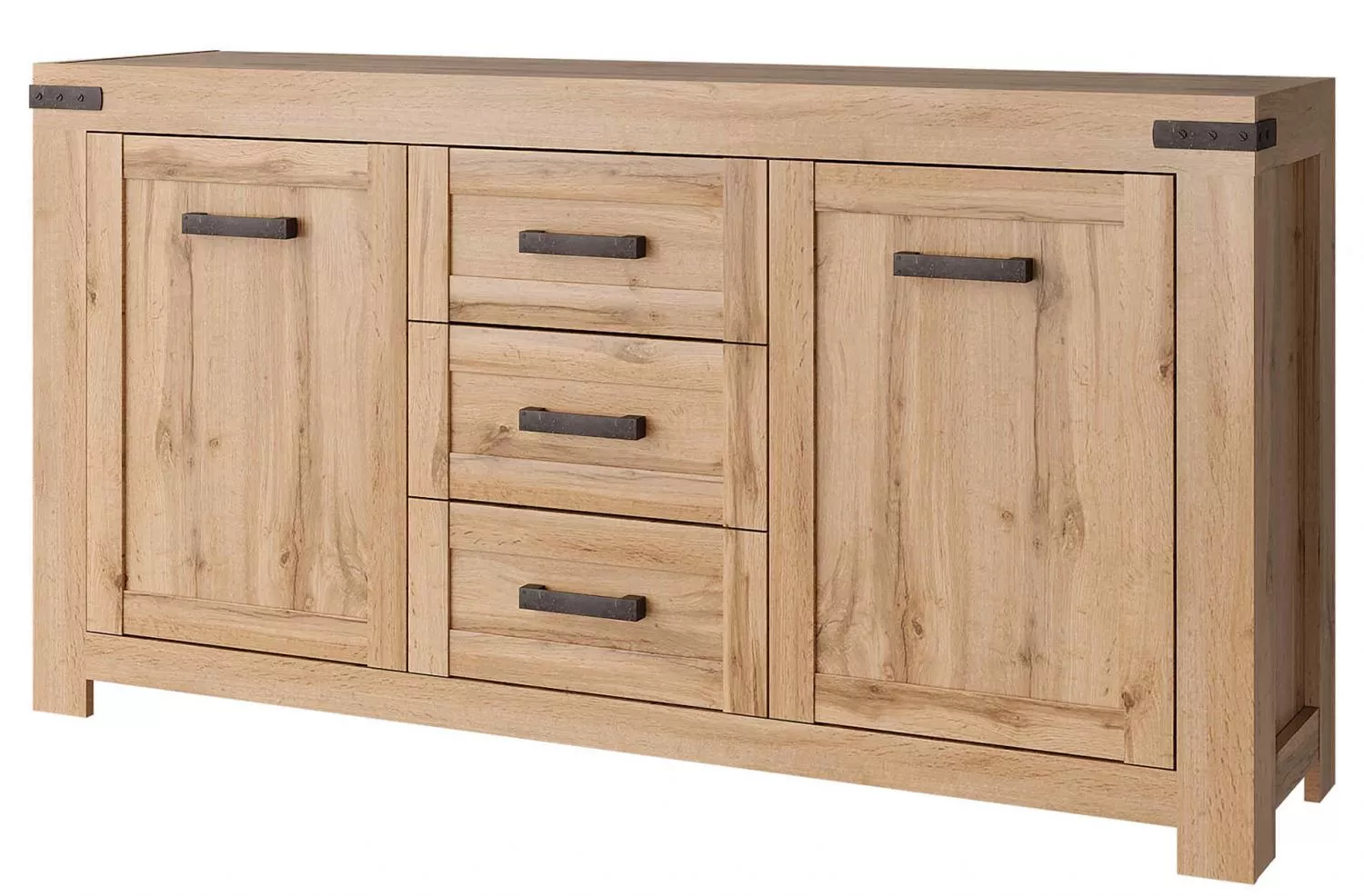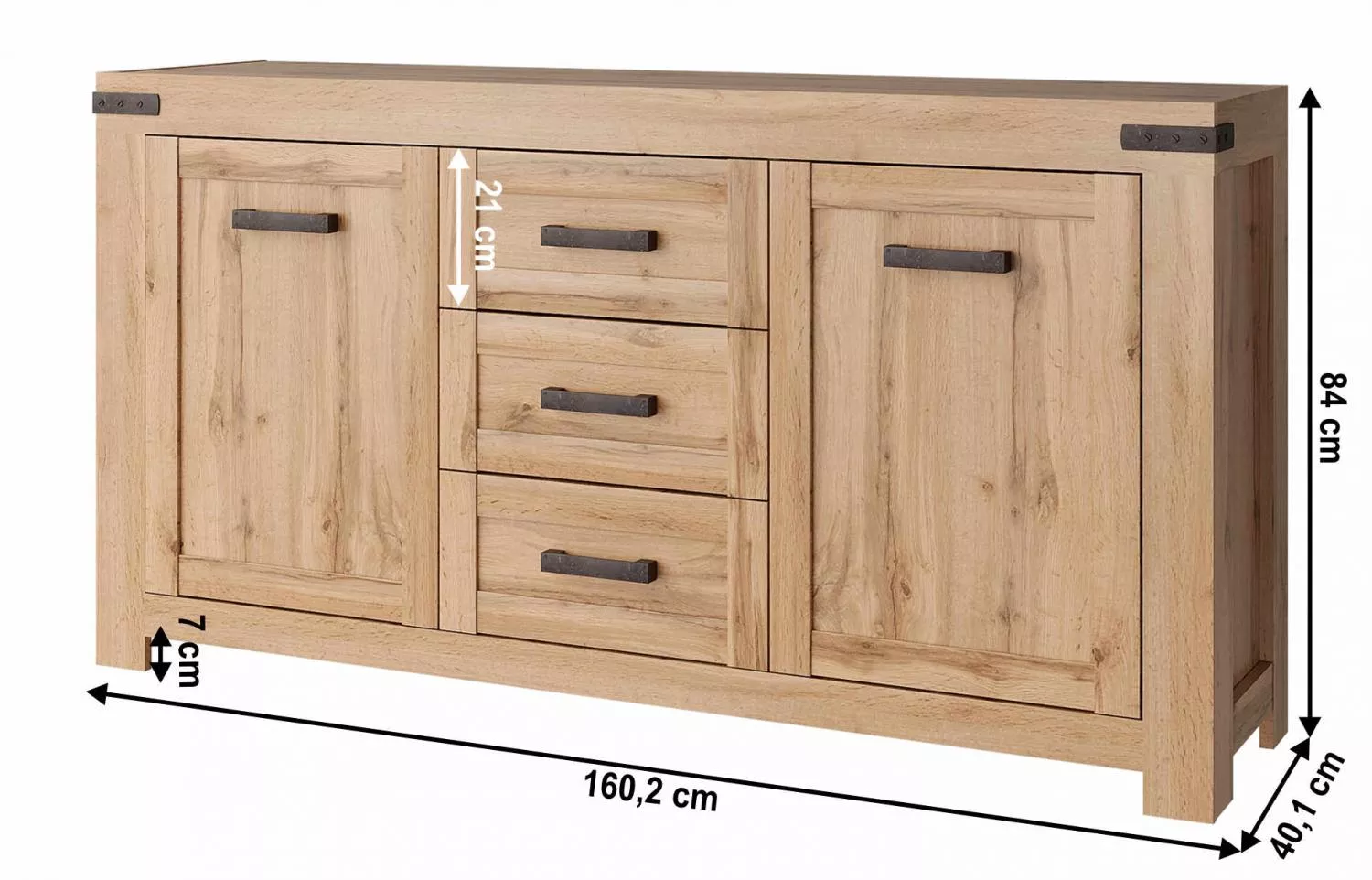 Komoda je dvoudveřová a nabízí promyšlené uspořádání úložného prostoru. Za dvířky se nachází police, které poskytují dostatek místa pro uložení nádobí, textilií, dokumentů nebo dalších každodenních potřeb. Další úložný prostor tvoří tři zásuvky, které jsou ideální pro drobnosti a věci, jež chcete mít snadno a rychle po ruce. Korpus komody je vyroben z laminované dřevotřísky, dvířka jsou z MDF, což přispívá k pevnosti a stabilitě celého kusu nábytku. Komoda stojí na nožičkách, které nábytek opticky odlehčují a zároveň usnadňují úklid pod ním.