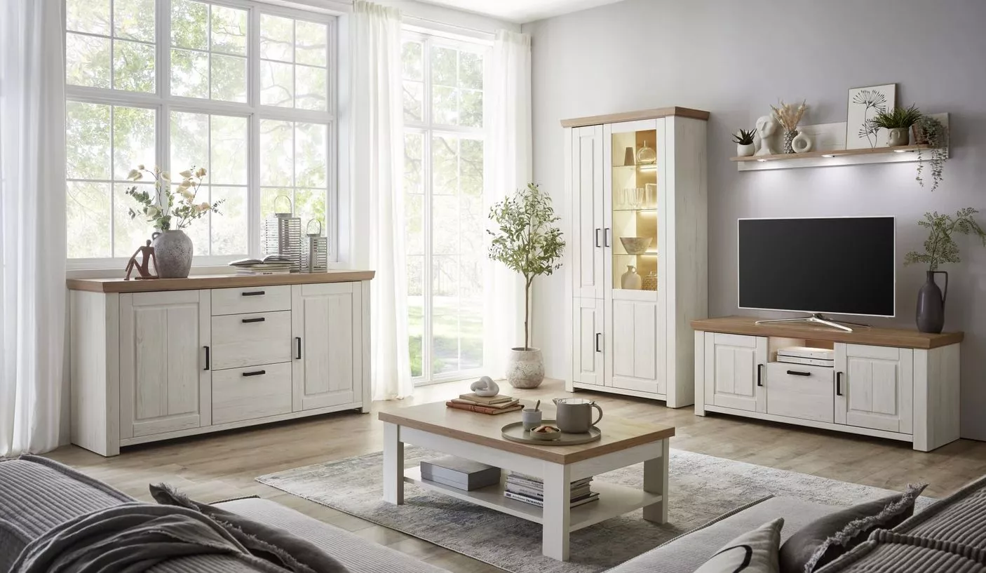 Kombinuje komody s úložným prostorem, televizní stolek pro elektroniku, praktickou polici na dekorace a konferenční stolek, který přirozeně doplní sezení. Dekor pino aurelio v kombinaci s dubem artisan působí svěže a moderně, ale pořád příjemně teple.