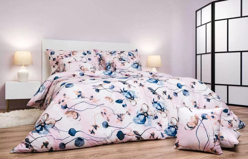 Romantické ložní prádlo Bloom elegance vyniká jemným květinovým vzorem v odstínech růžové, modré a bílé na pudrovém podkladu. Do ložnice přináší něhu, lehkost a harmonickou atmosféru. Design je ideální pro milovníky elegantního, ale zároveň decentního stylu. Skvěle se kombinuje s prostěradly v barvě bílé, pudrové nebo opálové.