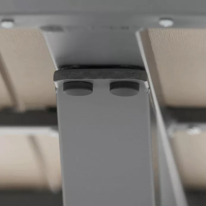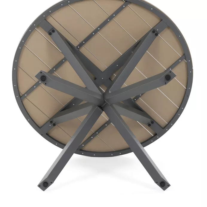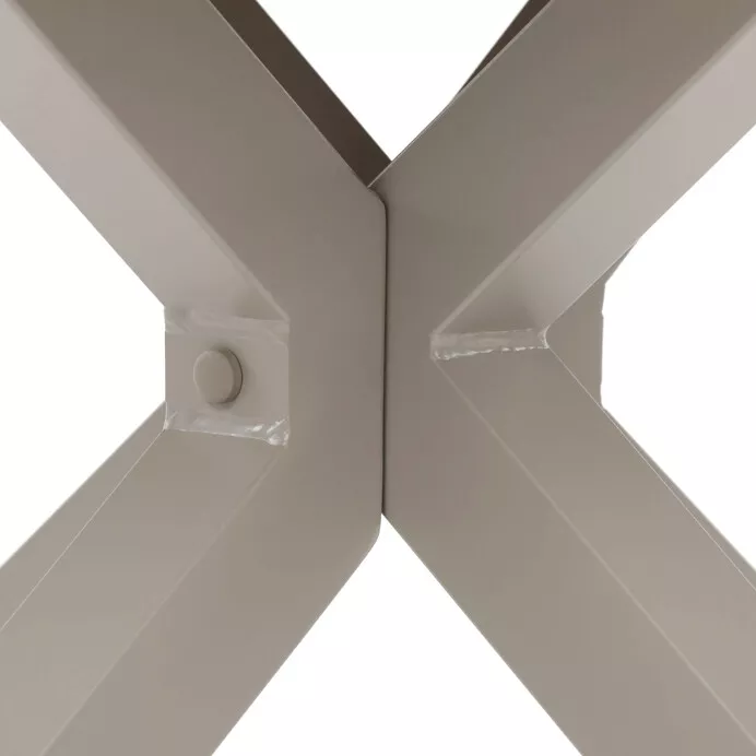Pevná hliníková konstrukce zajišťuje stabilitu a dlouhou životnost. Stůl stojí na čtyřnohé podnoži z hliníku v šedém odstínu, která poskytuje bezpečné a pevné postavení i na mírně nerovném povrchu. Hliník je lehký, ale zároveň dostatečně pevný, což usnadňuje manipulaci bez ztráty stability.
