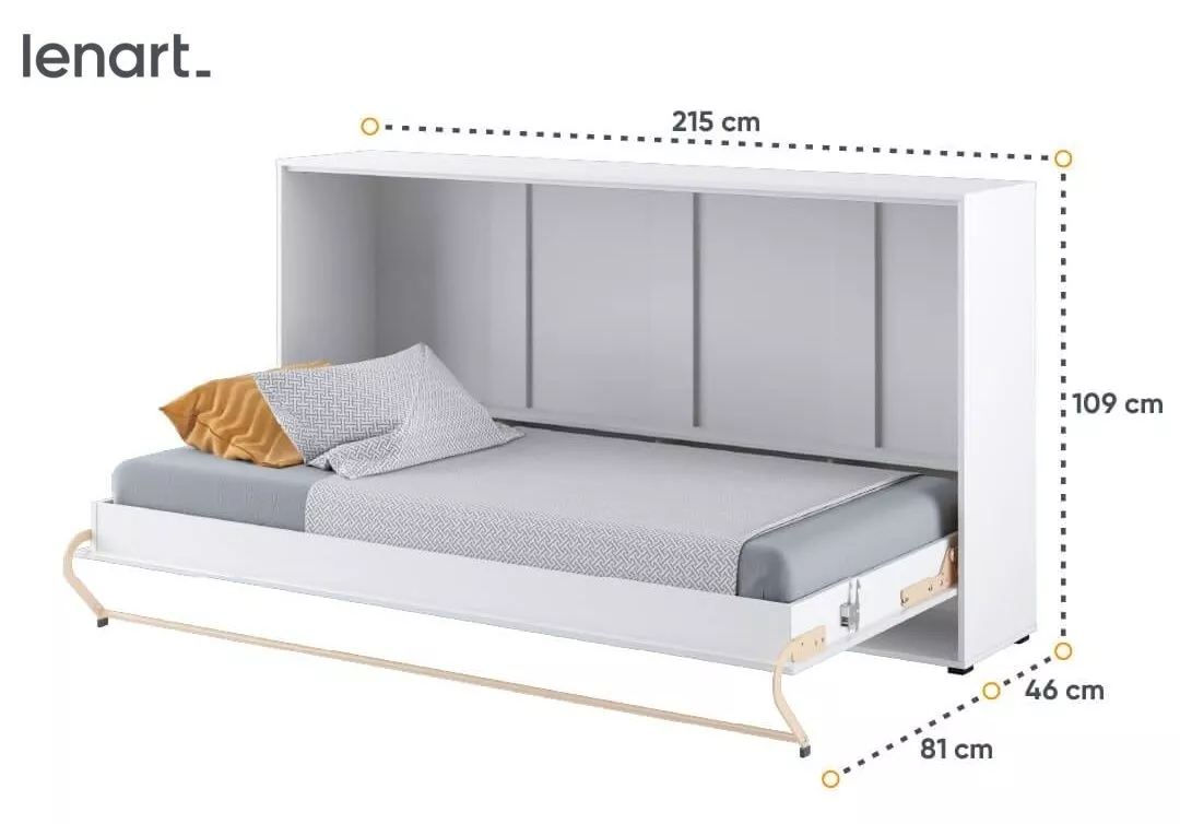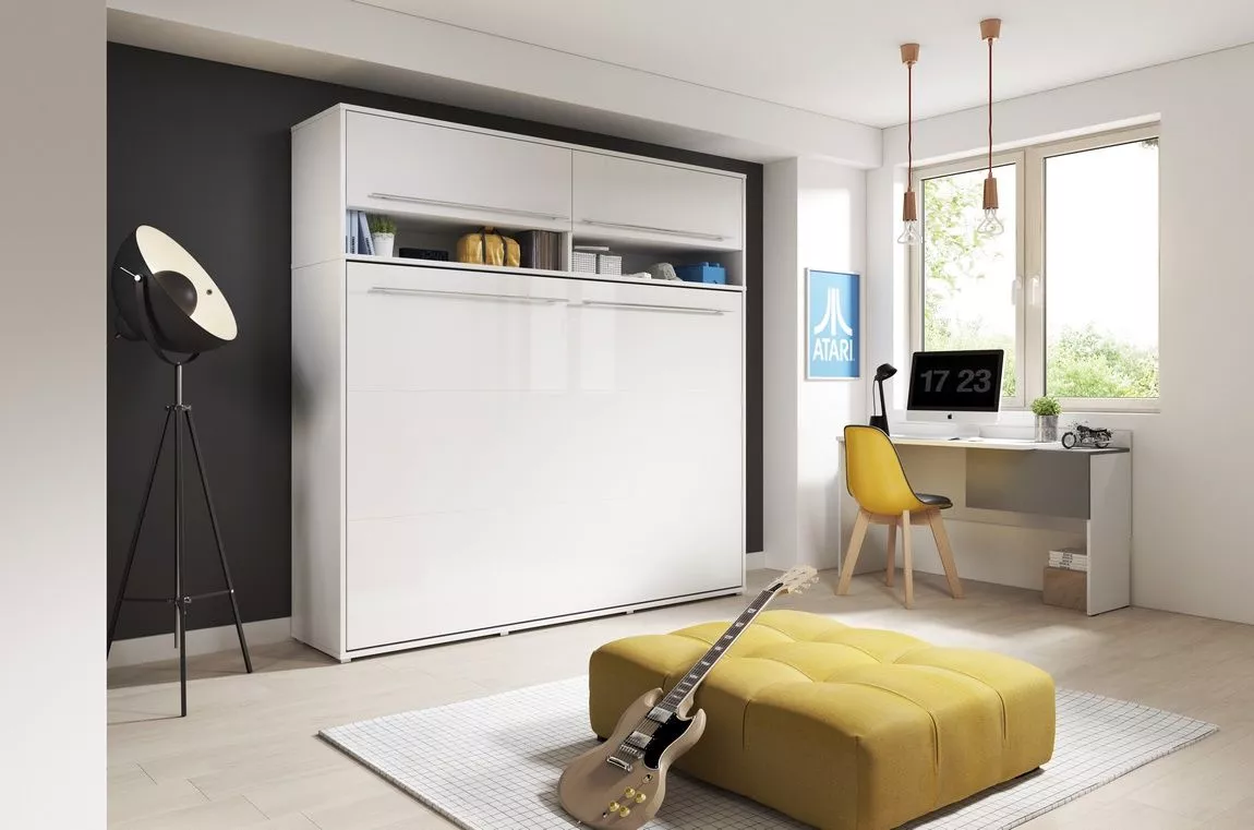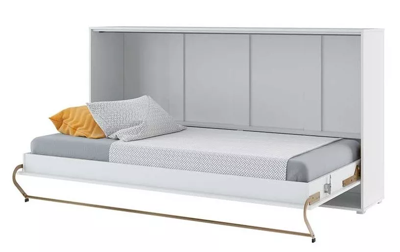 Moderní sklápěcí postel o šířce 90 cm je praktickým řešením pro menší byty, dětské a studentské pokoje, ložnice i obývací prostory. Korpus nábytku je proveden v matné bílé barvě, čelo v elegantním bílém lesku, což vytváří čistý a nadčasový vzhled, který snadno zapadne do různých interiérů.