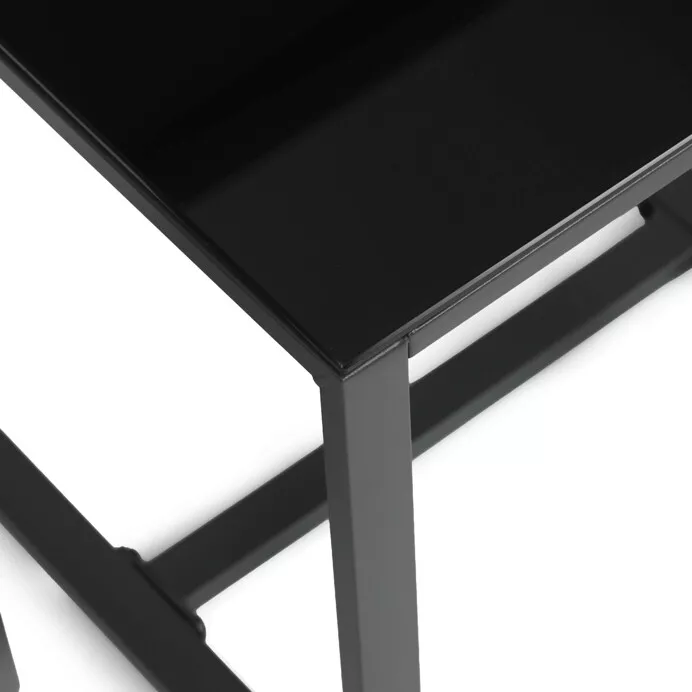 Stolek je doplněn deskou z černého tvrzeného skla, která působí elegantně, je snadno udržovatelná a odolná vůči běžnému zatížení. Stabilní kovový rám zajišťuje bezpečné a dlouhodobé používání.