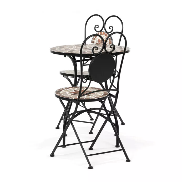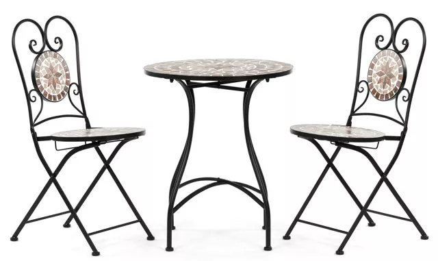 Romantický zahradní set složený z kulatého stolu a dvou židlí je ideální volbou pro balkon, terasu i menší zahradu. Kombinuje pevnou kovovou konstrukci s dekorativní keramickou mozaikou, která dodává celku výrazný vizuální charakter a nádech stylu Provence.