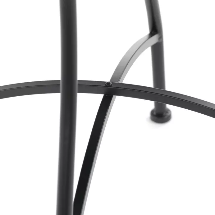 Deska stolu je tvořena keramickou mozaikou v přírodních a teplých odstínech. Povrch je nejen esteticky působivý, ale také snadno udržovatelný a vhodný pro venkovní použití. Kovové nohy stolu i židlí jsou tvarovány do elegantních oblouků a doplněny jemnými kovanými detaily, které podtrhují lehkost designu a zároveň zajišťují stabilitu.