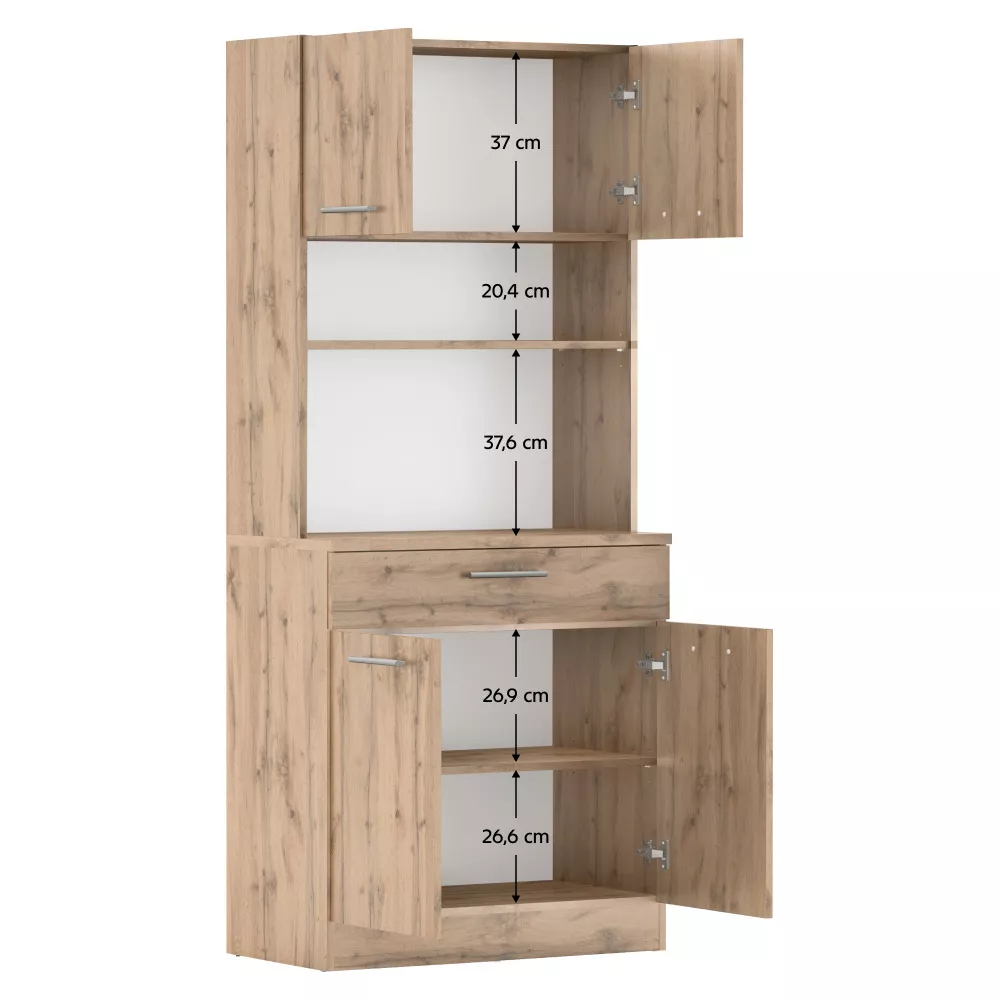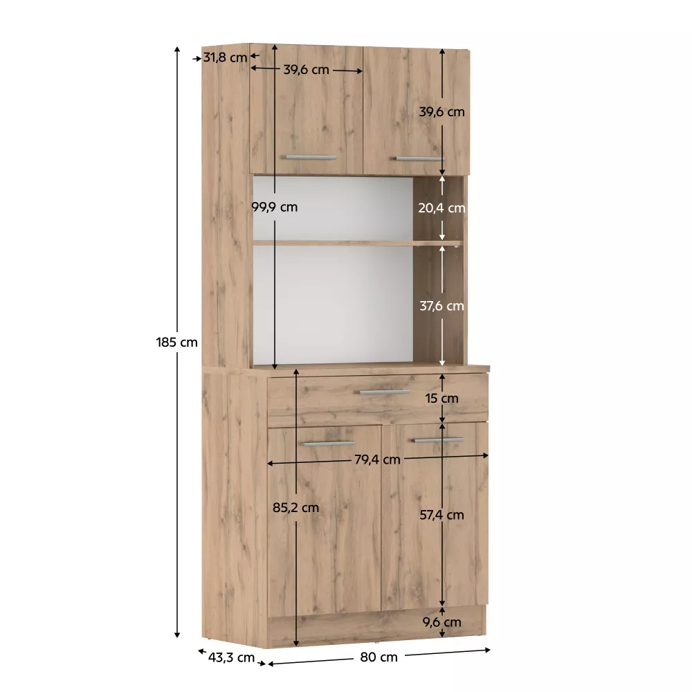 Uzavřené části poskytují dostatek místa pro nádobí, kuchyňské potřeby či textilie, zatímco otevřené police jsou ideální pro vystavení knih, rostlin nebo dekorací, které dodají prostoru osobitý charakter. Nosnost jednotlivých polic je 5 kg. Zásuvka o rozměrech 79,4 × 15 cm má nosnost 5 kg a je vhodná pro uložení drobností, které chcete mít vždy po ruce.