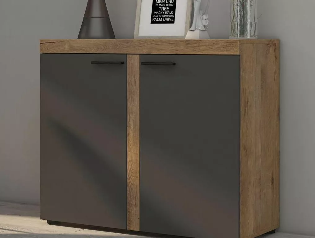 Komoda Rizo 2D je praktický a nadčasový kus nábytku, který skvěle doplní bytovou stěnu, ale stejně dobře obstojí i samostatně. Díky šířce 97 cm nabídne příjemně velký úložný prostor, aniž by v místnosti působila těžce. Za dvěma dvířky se nachází dvě police, takže si snadno uspořádáte věci přehledně ? od dokumentů přes textil až po domácí drobnosti.
