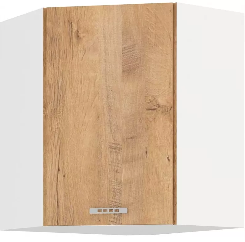 Vrchní rohová kuchyňská skříňka Sally 60×60 gn 72 je chytré řešení pro využití rohu kuchyňské linky i v horní části sestavy. Pomůže vám získat další úložný prostor nad pracovní deskou, aniž by roh zůstal nevyužitý. Bílý korpus z lamina (16 mm) působí čistě a světle, zatímco dvířka v dekoru dub sonoma dodají kuchyni příjemně teplý vzhled.