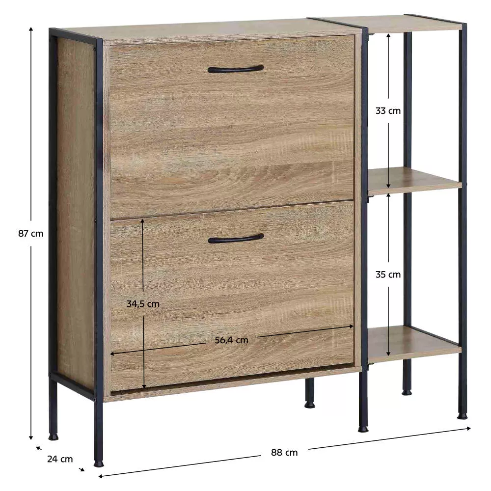 Moderní botník SOVIO je praktickým a stylovým řešením pro každou předsíň. Spojuje funkčnost s minimalistickým designem a pomůže vám udržet obuv přehledně uspořádanou, aniž by zabíral zbytečně mnoho místa. Díky kombinaci dekoru dubu a černého kovového rámu působí elegantně a snadno zapadne do moderních interiérů.