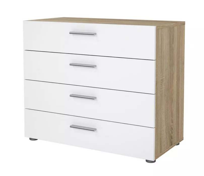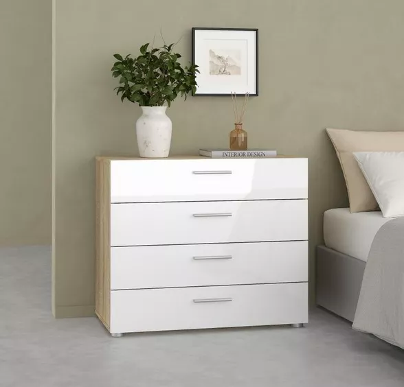 Komoda Pedro 505 je praktická komoda se čtyřmi prostornými zásuvkami, která se hodí do ložnice, obýváku i předsíně. Kombinace dekoru dub sonoma s bílým leskem působí moderně, ale zároveň příjemně teple, takže komoda snadno zapadne do většiny interiérů. Díky šířce 80 cm je kompaktní, přitom nabídne dost místa na prádlo, dokumenty i drobnosti, které chcete mít uklizené.