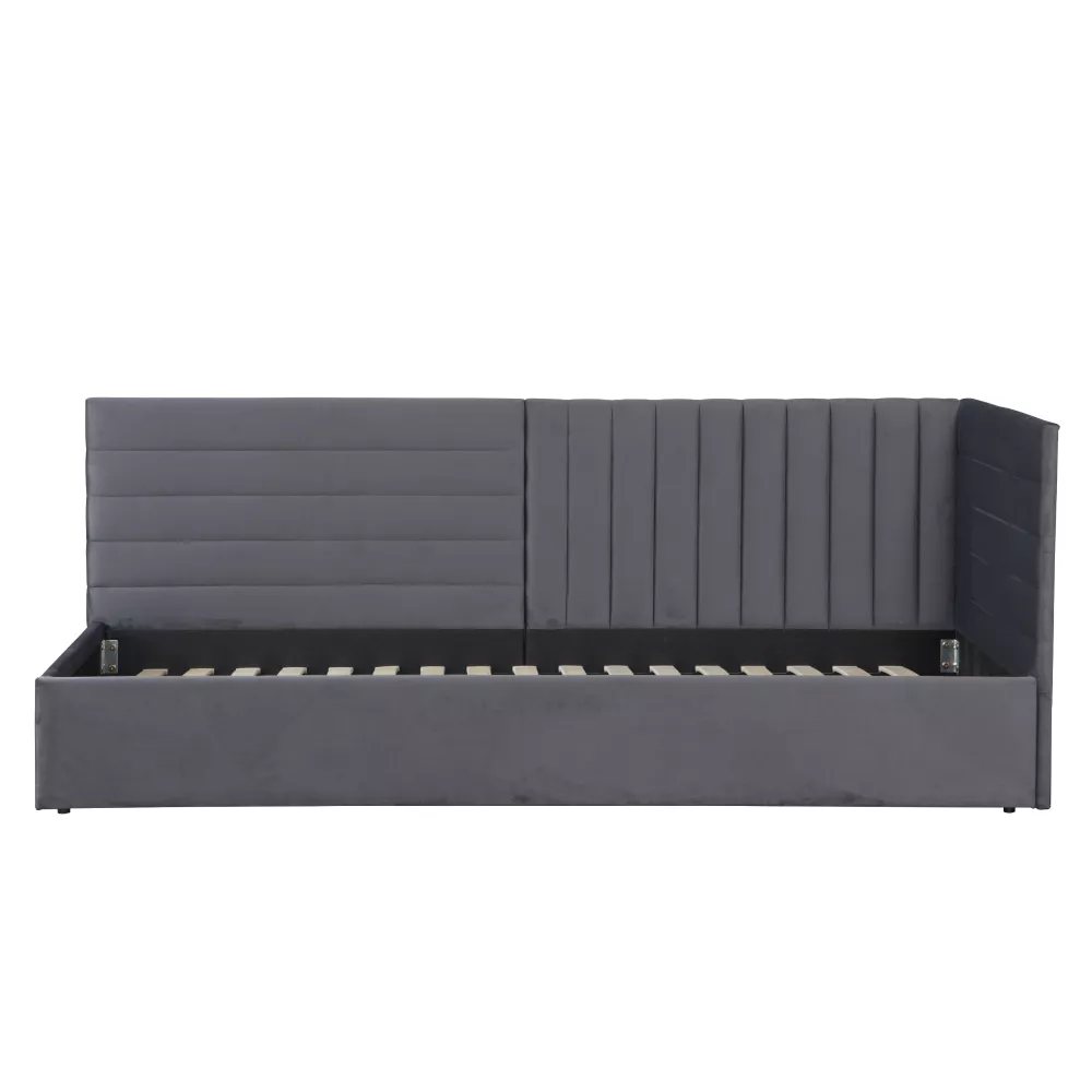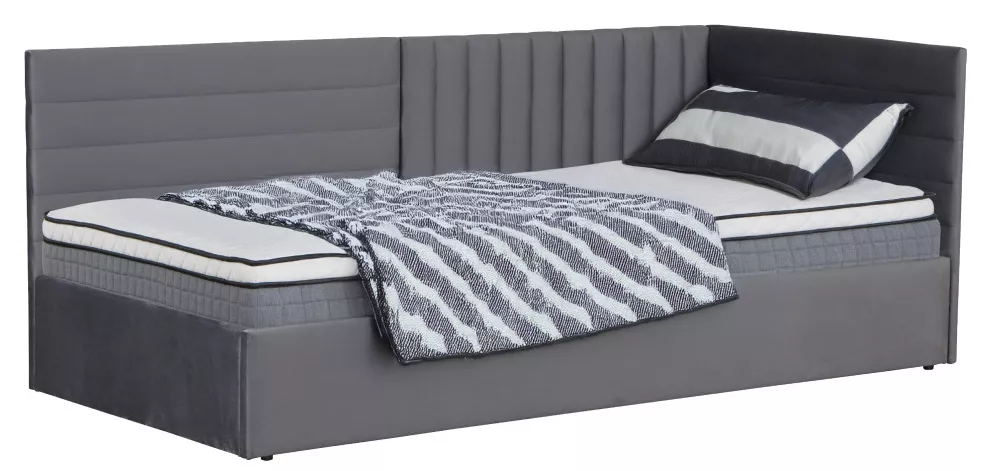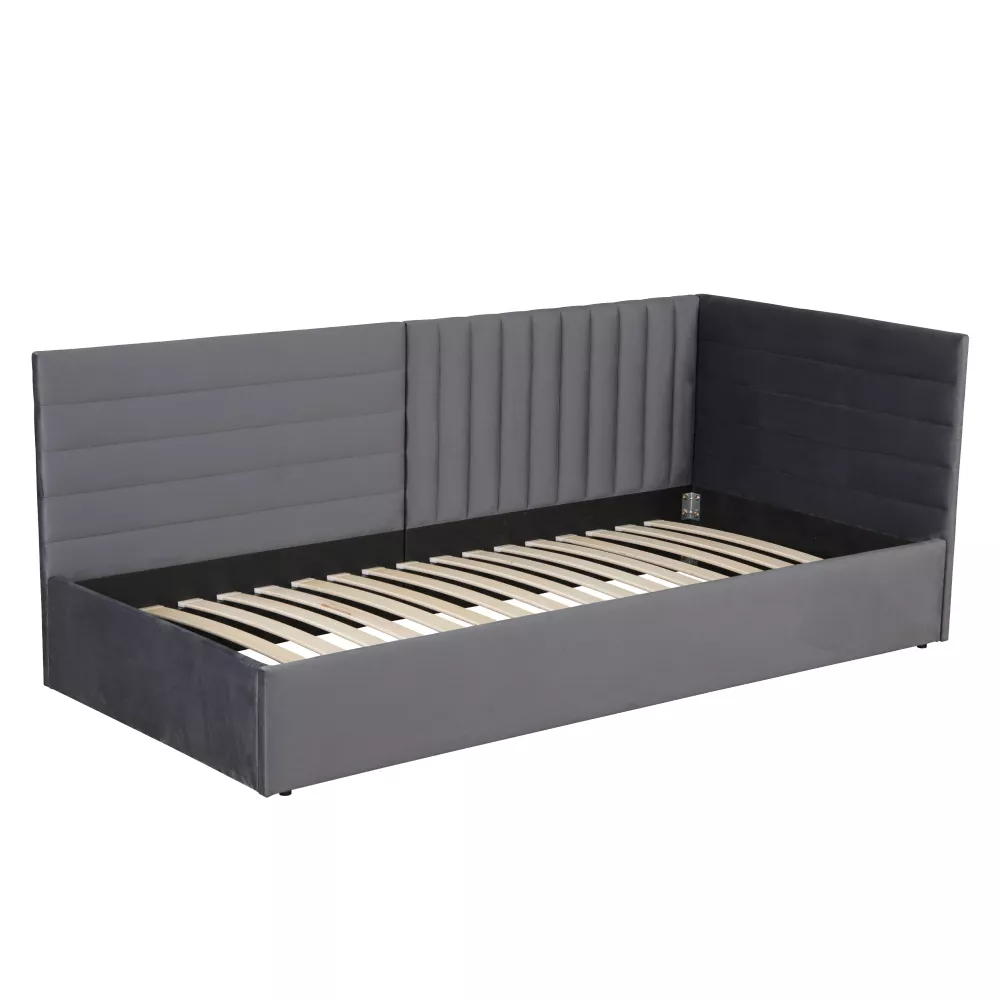 Konstrukce je vyrobena z MDF o tloušťce 1,8 cm, což zajišťuje pevnost a stabilitu. Čalounění kvalitní Velvet látkou působí měkce a elegantně. Dekorativně prošívané čelo slouží nejen jako výrazný designový prvek, ale také jako pohodlná opěrka při čtení či odpočinku. Vyvýšená boční část navíc chrání stěnu a zvyšuje komfort používání.
