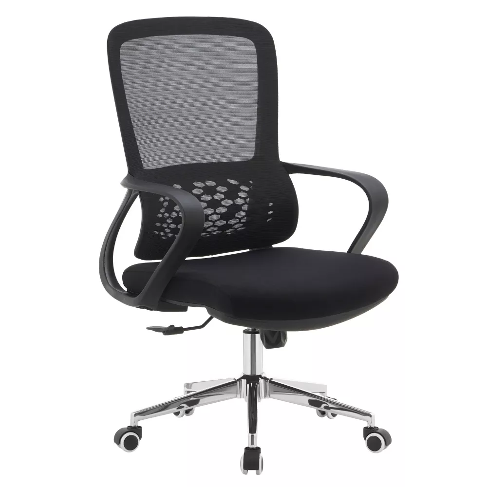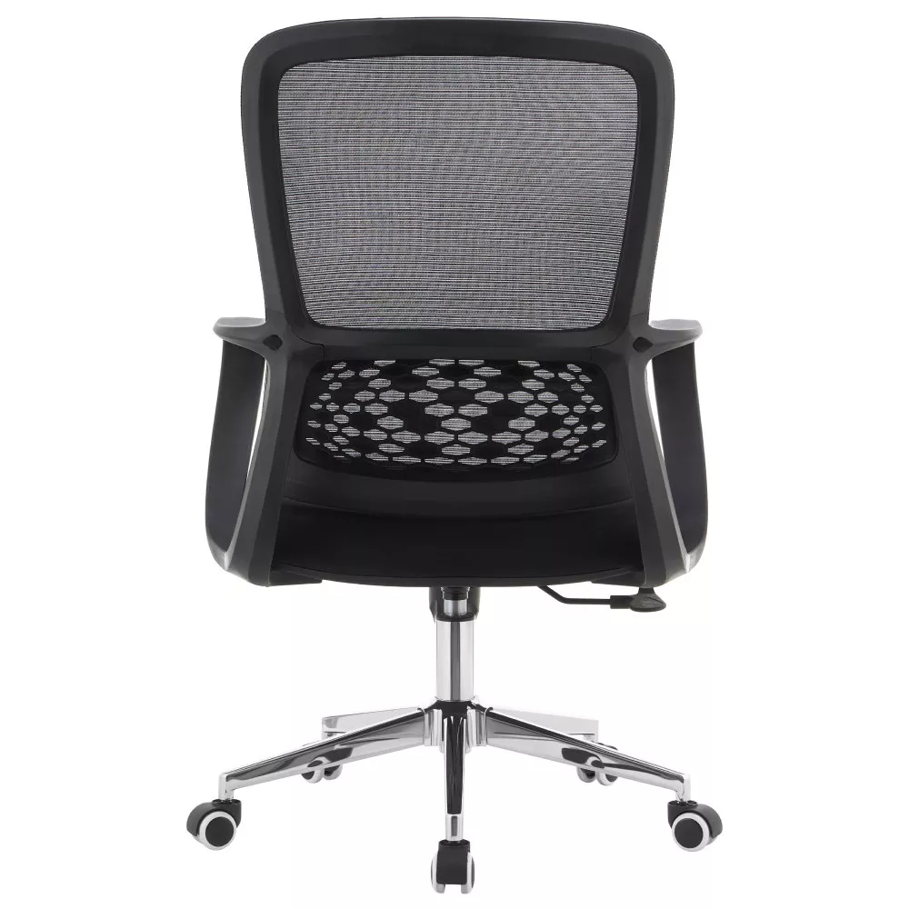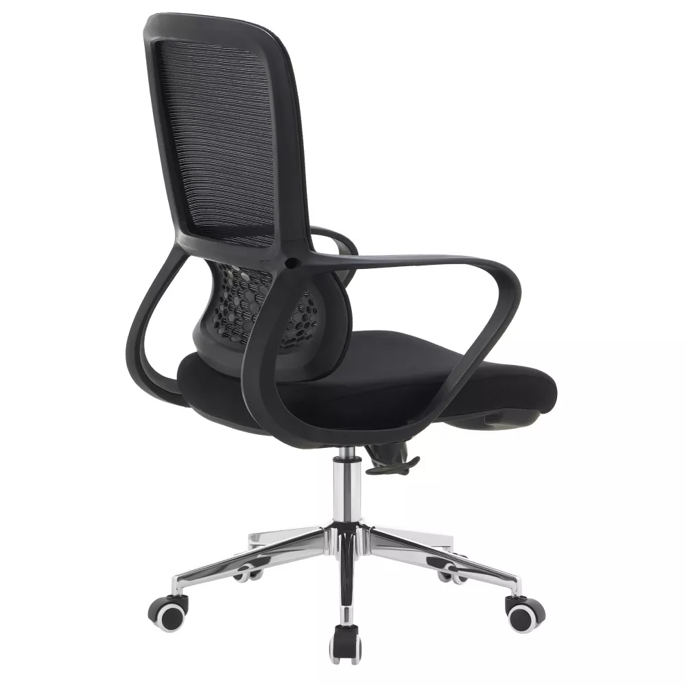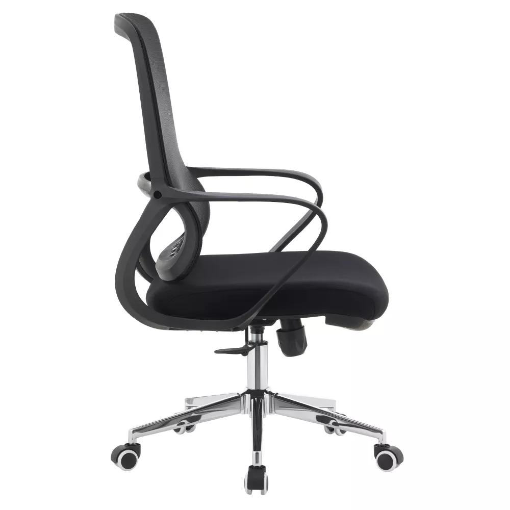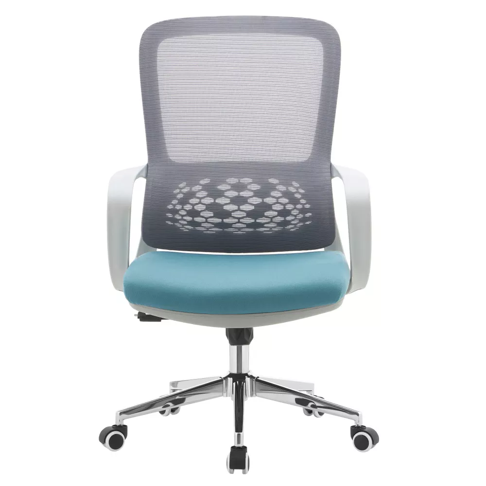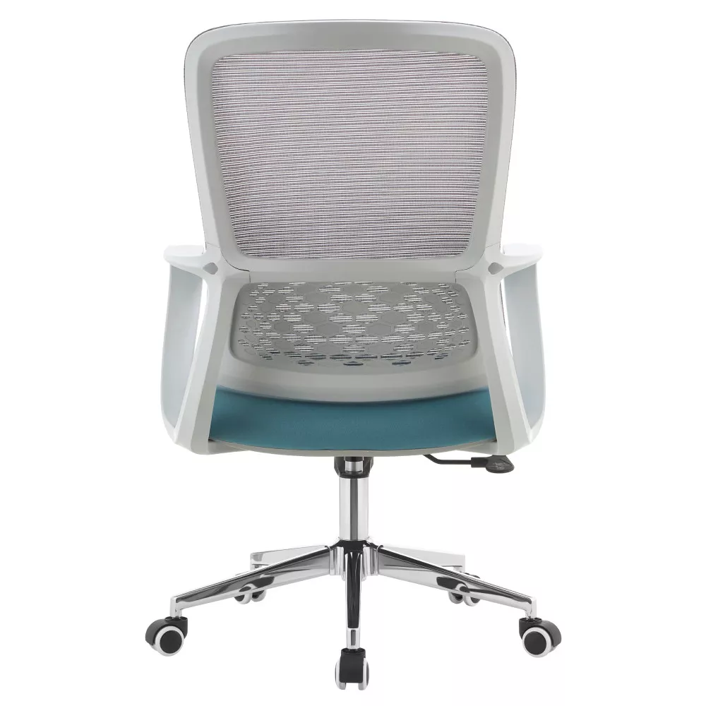 Křeslo kombinuje prodyšnou šedou síťovinu s modrou látkou a elegantní chromovou podstavou. Ergonomicky tvarovaná bederní opěrka podporuje správné držení těla a pomáhá odlehčit páteři během celodenního sezení. Díky nastavitelnému sedu a funkci houpání si židli snadno přizpůsobíte podle svých potřeb.