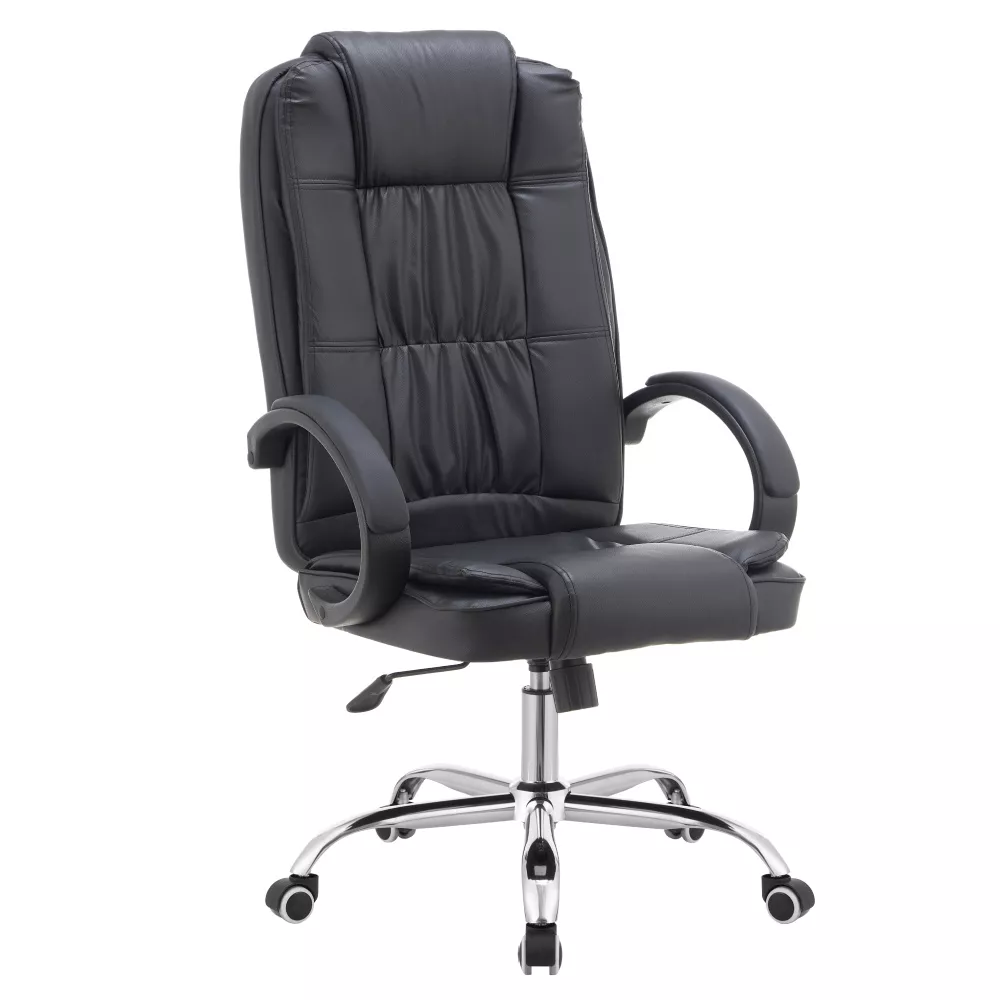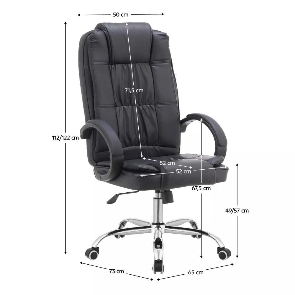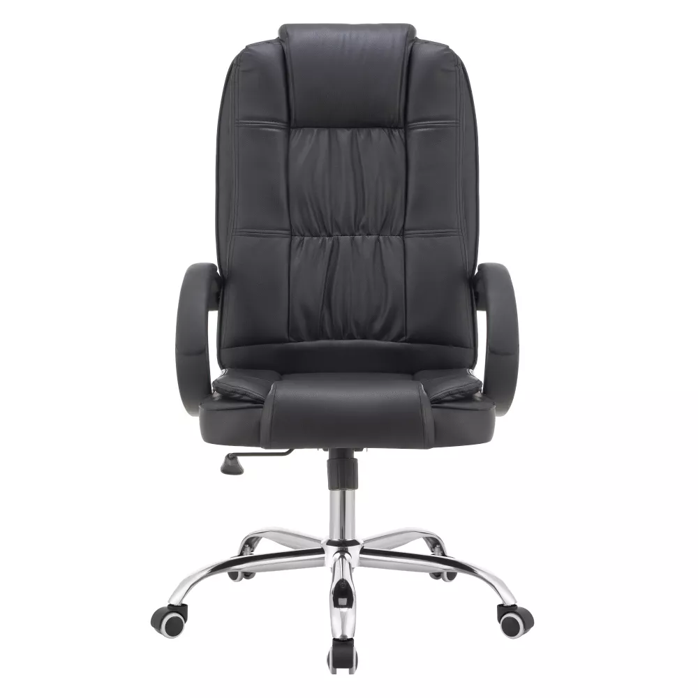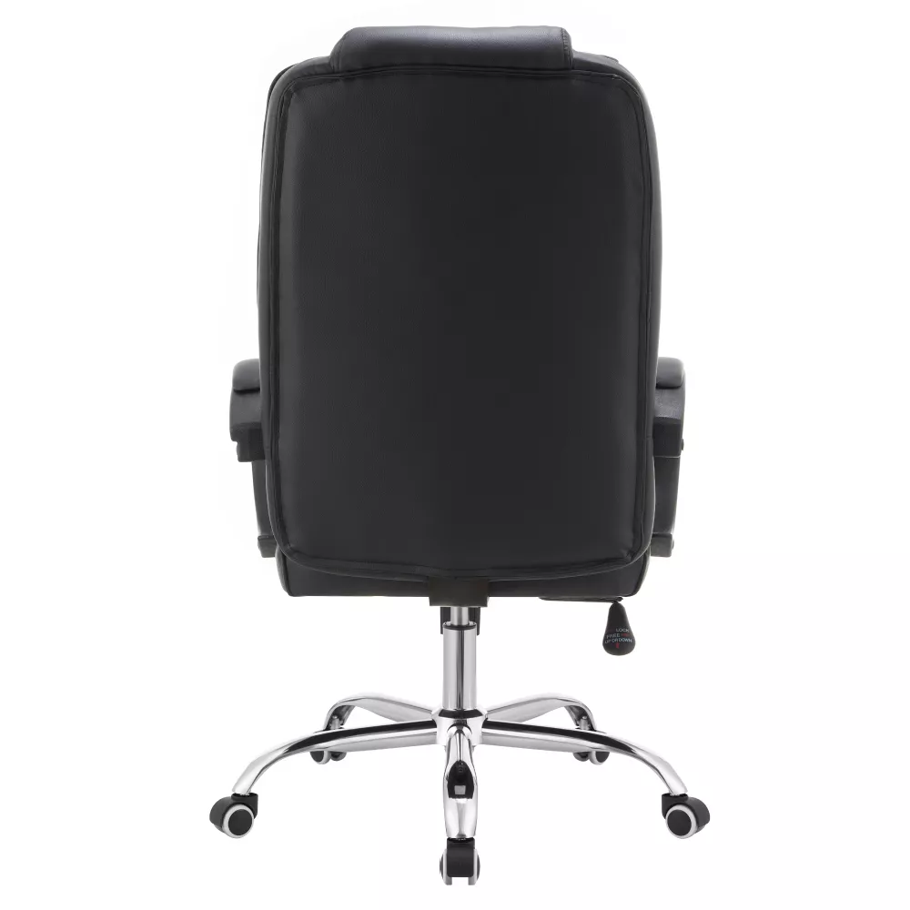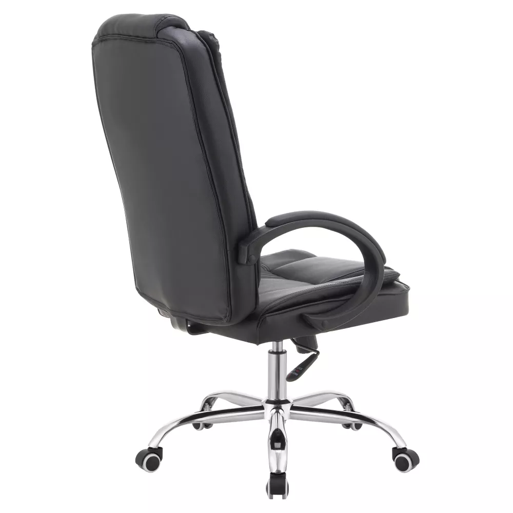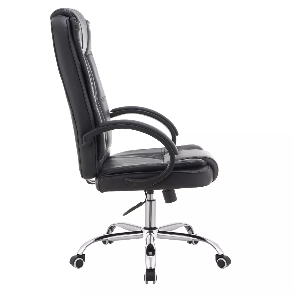 Černé čalounění z ekokůže působí elegantně a profesionálně, zatímco chromovaná kovová pětiramenná podstava dodává křeslu moderní vzhled a stabilitu. Čalouněné plastové područky zvyšují pohodlí při dlouhodobém sezení a podtrhují celkový design.