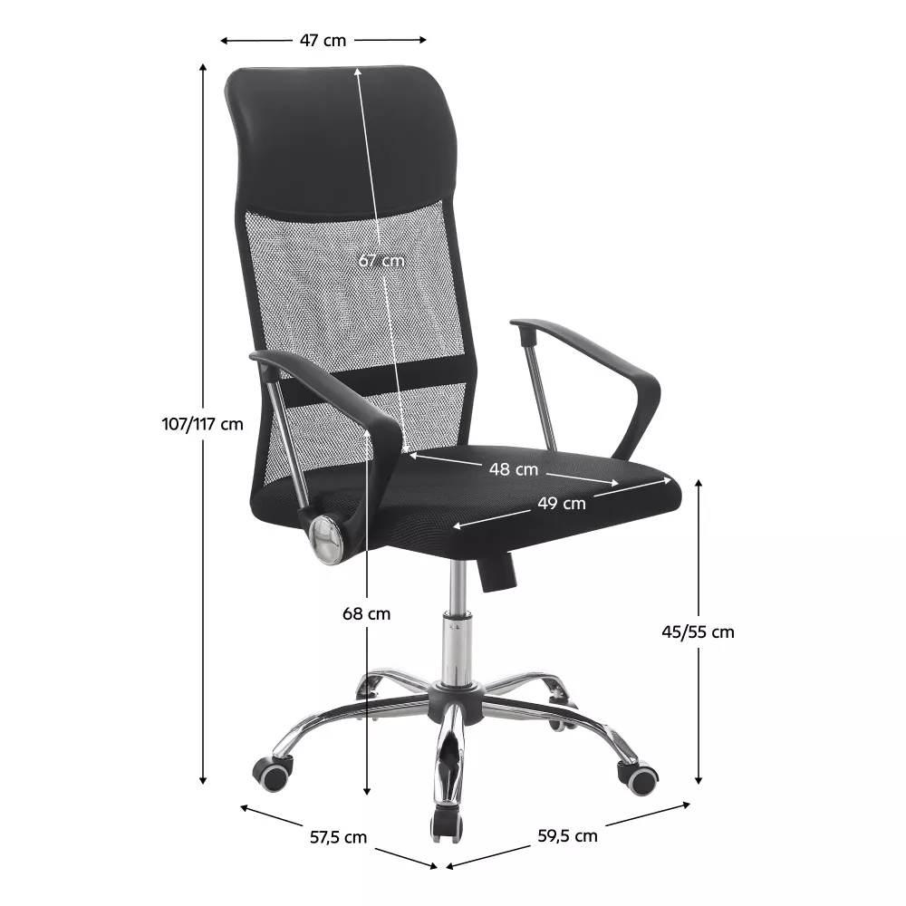 Sedák a opěradlo jsou čalouněny kombinací kvalitní ekokůže a prodyšné síťoviny. Tato kombinace zajišťuje komfort při sezení i dostatečné odvětrávání během delší práce. Kovová chromovaná růžice pod sedadlem dodává křeslu stabilitu a vizuální lehkost, plastové područky pak pohodlnou oporu rukou.