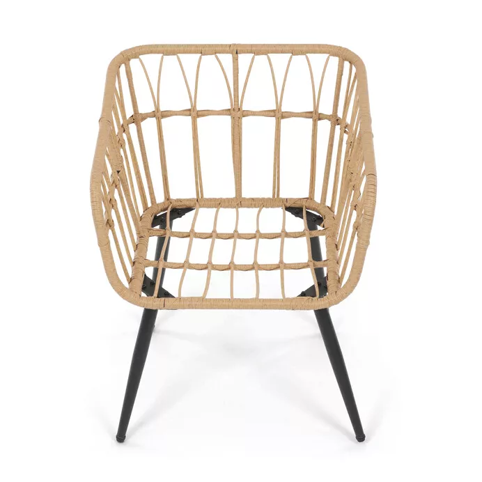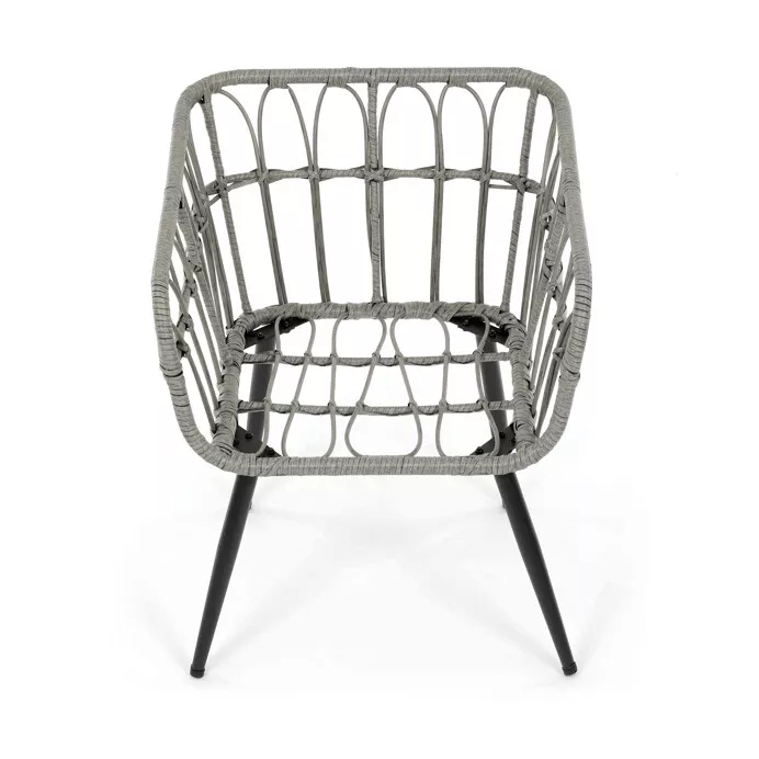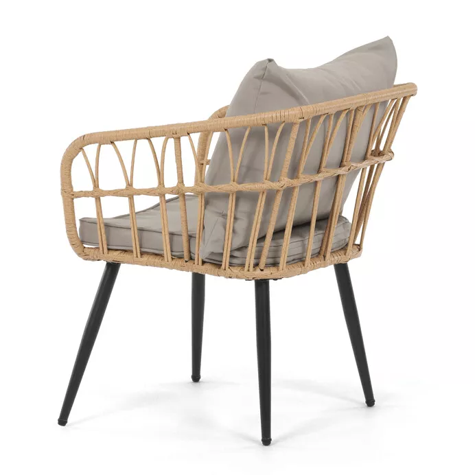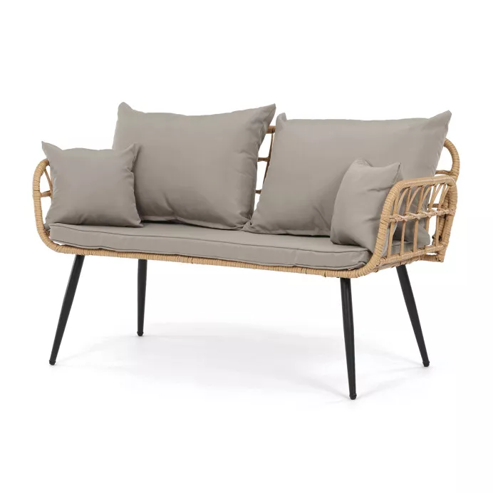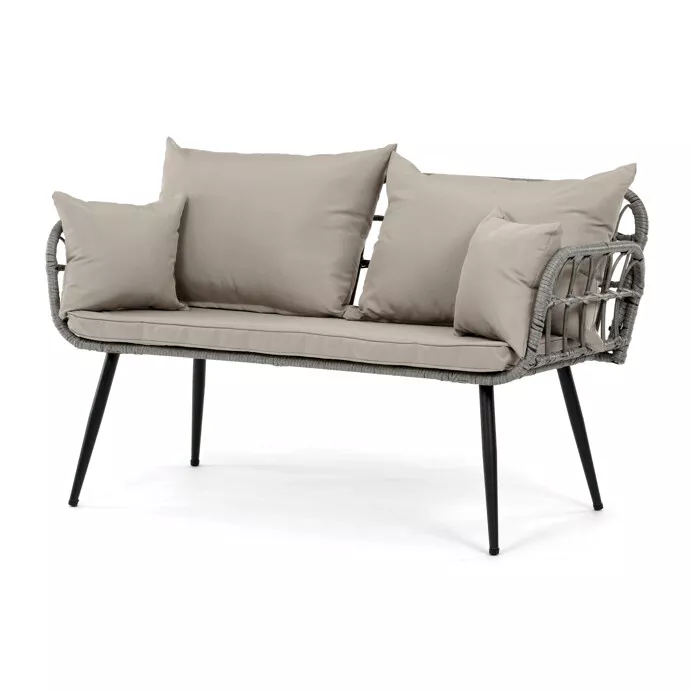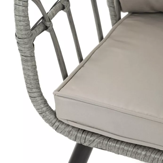 Pevná kovová konstrukce v černé barvě zajišťuje stabilitu a dlouhou životnost. Výplet z umělého ratanu (polyratan) dodává soupravě lehký a přírodní vzhled. Sedáky a opěradla jsou potaženy šedou voděodolnou látkou (100% polyester), která je nenáročná na údržbu a odolává venkovním podmínkám.