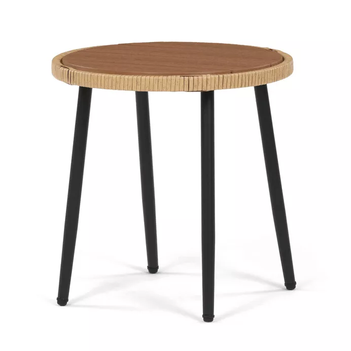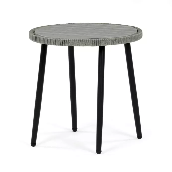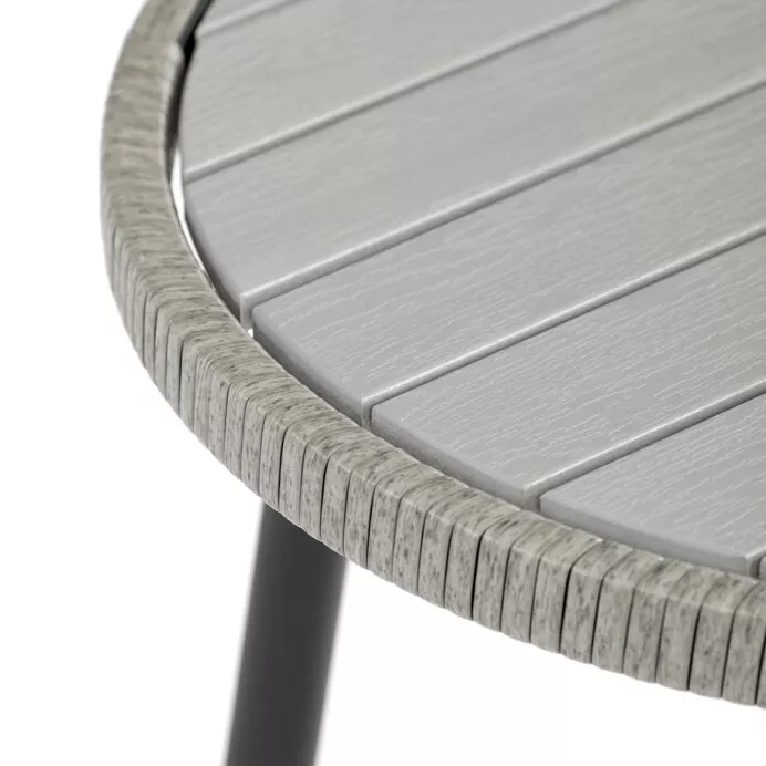 Součástí setu je praktický stolek s kruhovou deskou z polywoodu. Tento materiál je odolný vůči vlhkosti i běžnému opotřebení, takže je ideální pro venkovní použití.