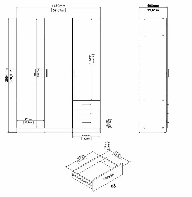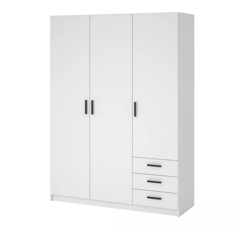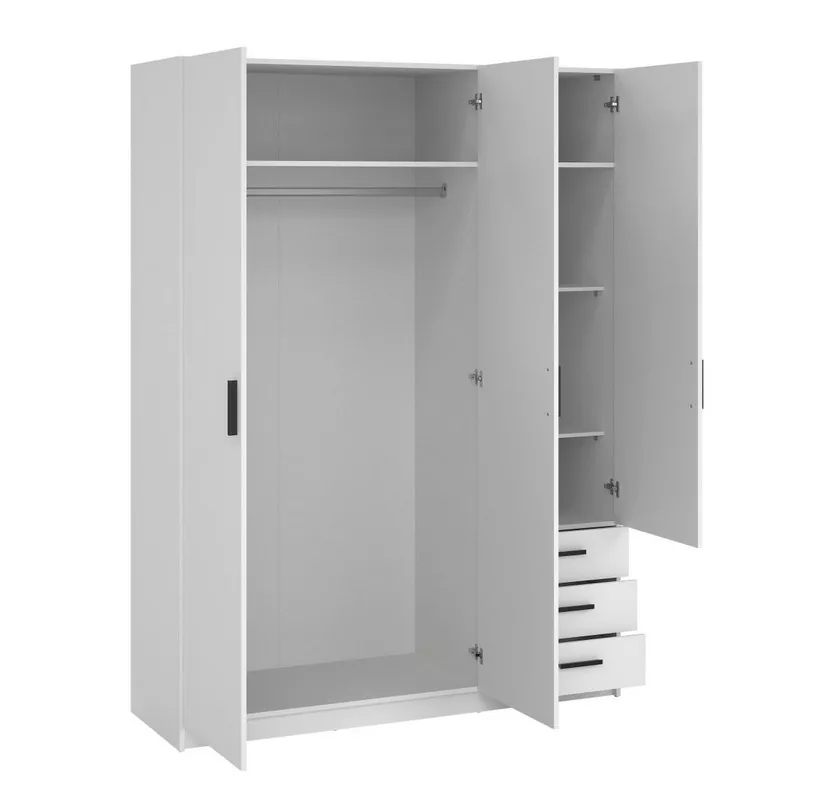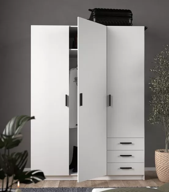 Šatní skříň Spike 085 je praktická volba pro každého, kdo chce mít oblečení i drobnosti přehledně uložené na jednom místě. Díky šířce 147 cm nabízí dost prostoru do ložnice, dětského pokoje i předsíně. Uvnitř najdete šatní tyč na zavěšení oblečení a nastavitelné police, které si snadno přizpůsobíte podle toho, co právě potřebujete ukládat. Velkým bonusem jsou také tři zásuvky - ideální na spodní prádlo, doplňky nebo věci, které chcete mít rychle po ruce.