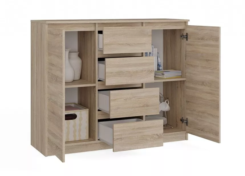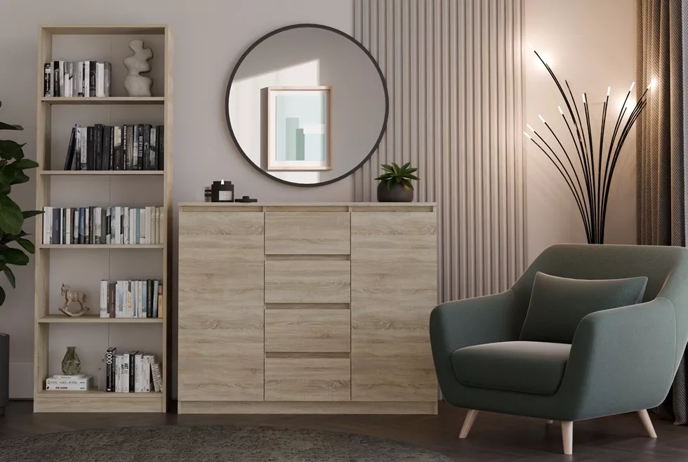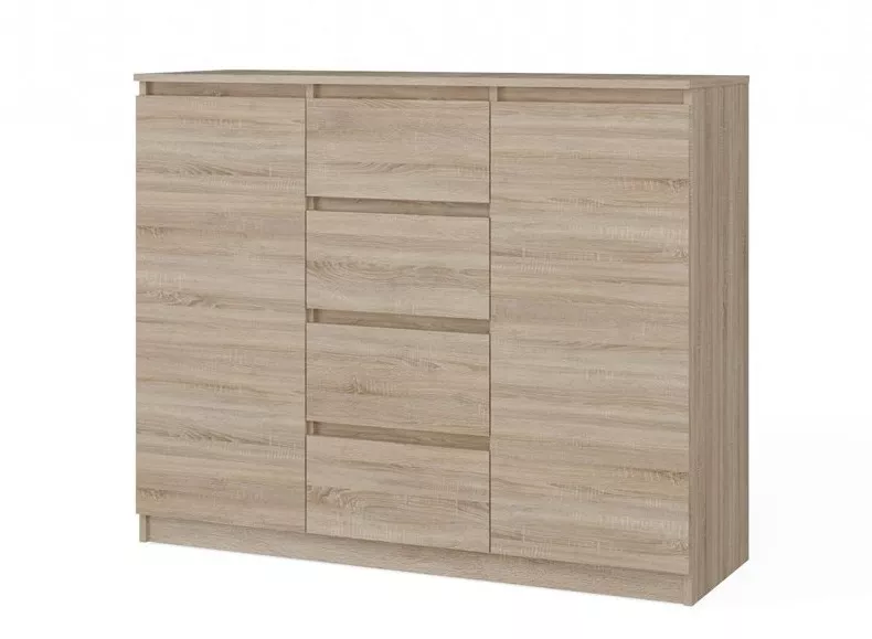 Komoda Malvína 2D4S je prostorná komoda o šířce 120 cm, která nabídne ještě víc místa na ukládání díky čtyřem zásuvkám a dvěma dvířkům. Skvěle se hodí do obýváku, ložnice i předsíně - všude tam, kde chcete mít věci přehledně uložené a zároveň zachovat čistý, moderní vzhled. Bezúchytková čela zásuvek a dvířka působí elegantně, nic neruší a komoda se pohodlně používá i v užších prostorech.