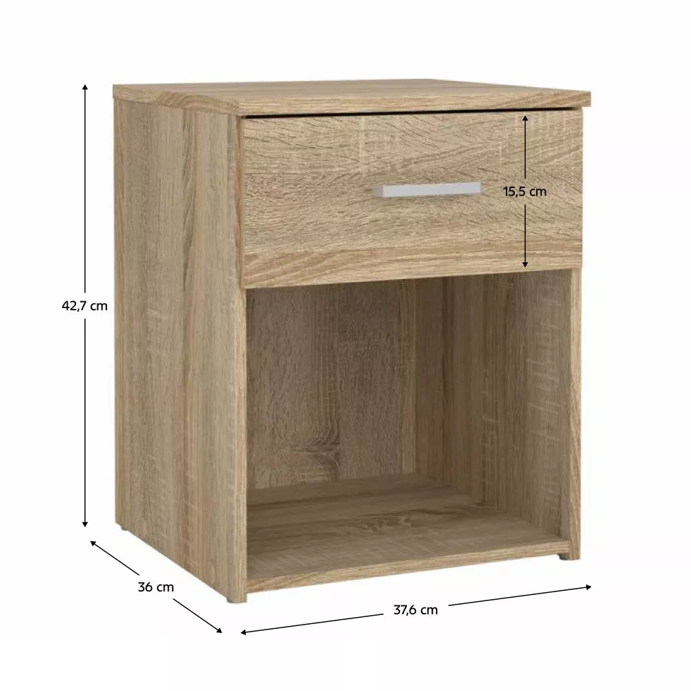 Stolek je vyroben z kvalitní dřevotřísky, která je nenáročná na údržbu a vhodná pro každodenní používání. Praktický úložný prostor tvoří zásuvka a otevřená police, díky nimž budete mít drobnosti, knihy nebo osobní věci vždy přehledně po ruce.