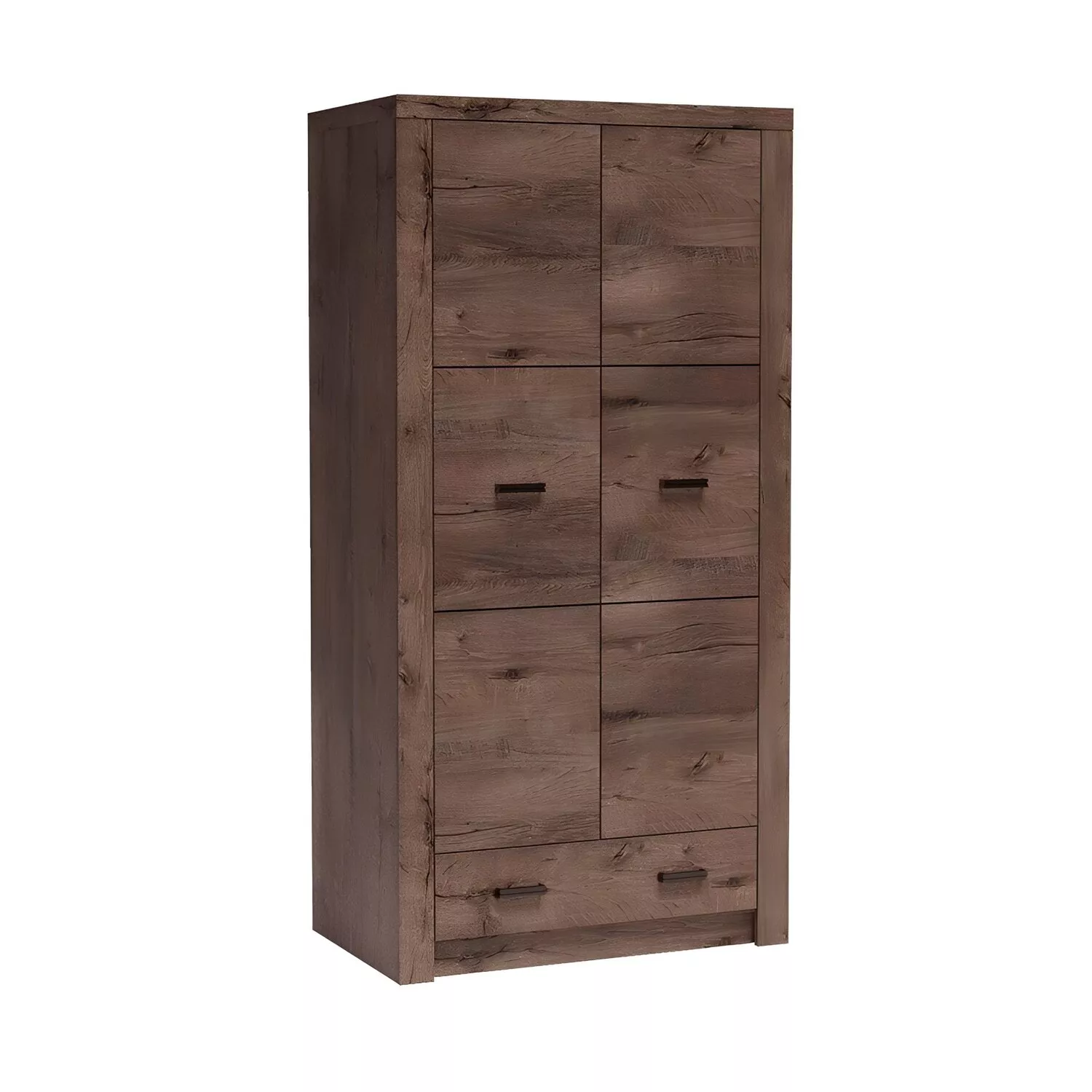 Konstrukce skříně je vyrobena z kombinace kovu a dřevotřísky, což zajišťuje pevnost, stabilitu a dlouhou životnost. Vnitřní uspořádání je řešeno kombinací policové a věšákové části, díky čemuž poskytuje dostatek prostoru pro uložení oblečení. Praktické zásuvky umožňují přehledné uložení menších věcí, jako je spodní prádlo, doplňky nebo drobnosti.