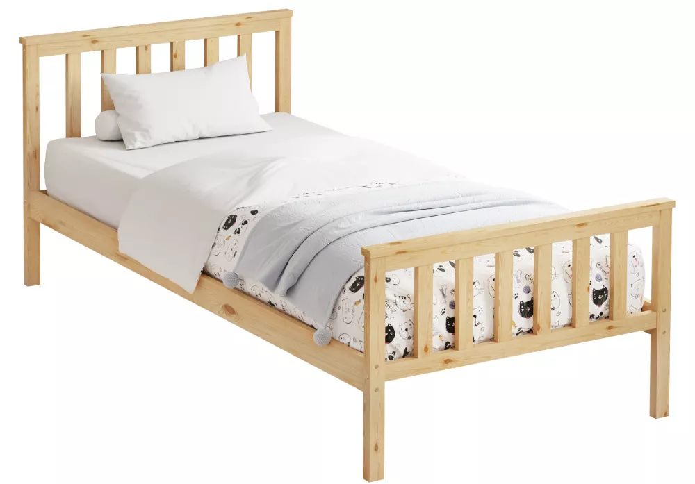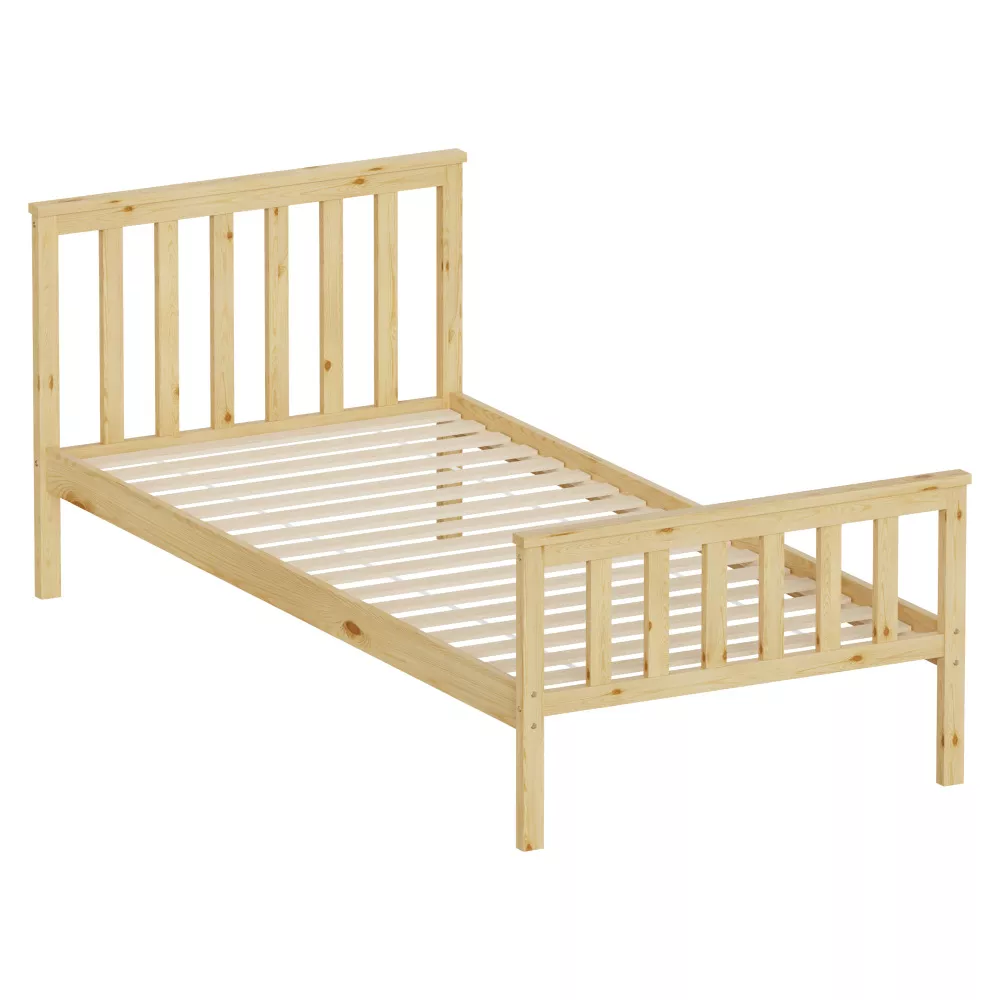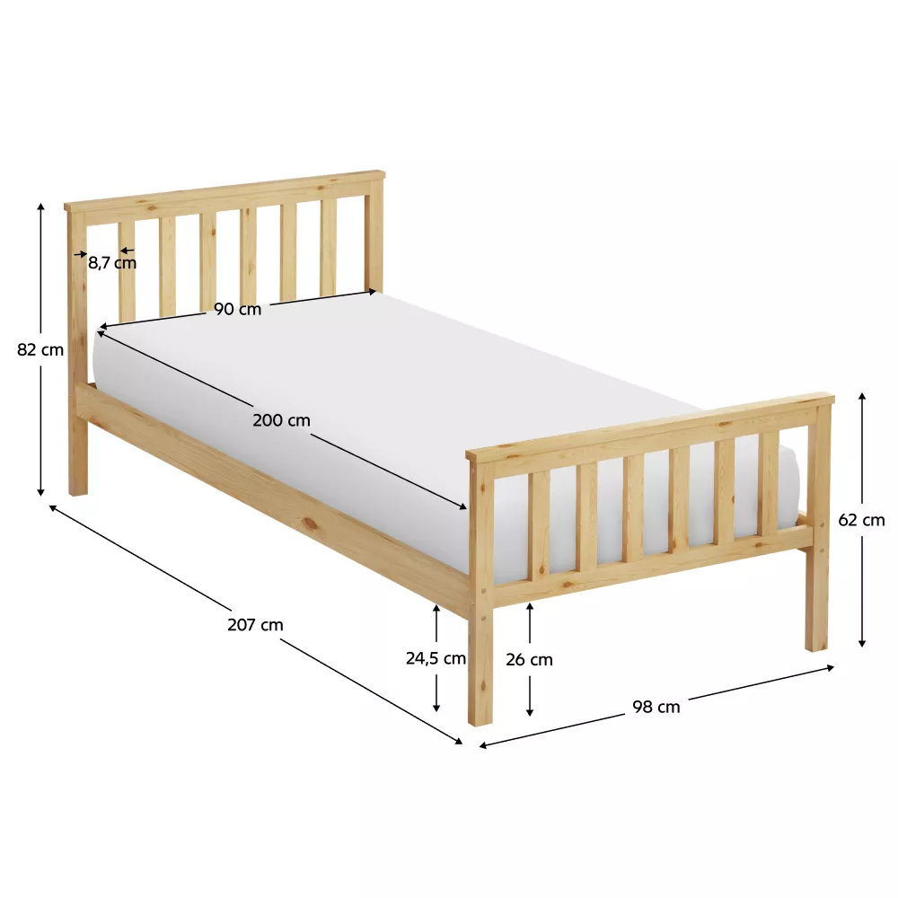 Postel je vyrobena z masivního borového dřeva, které zajišťuje pevnost, stabilitu a dlouhou životnost. Praktickým prvkem je otevřený prostor pod postelí, který nabízí místo pro uložení úložných boxů, lůžkovin nebo sezónních věcí a zároveň usnadňuje úklid.