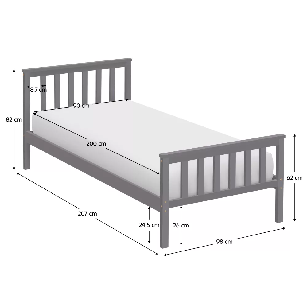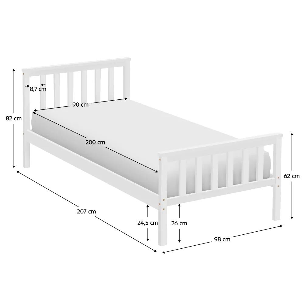 Součástí postele je rolovaný překližkový rošt. Matrace není součástí balení, doporučujeme zvolit matraci o rozměru 90 × 200 cm z naší nabídky.