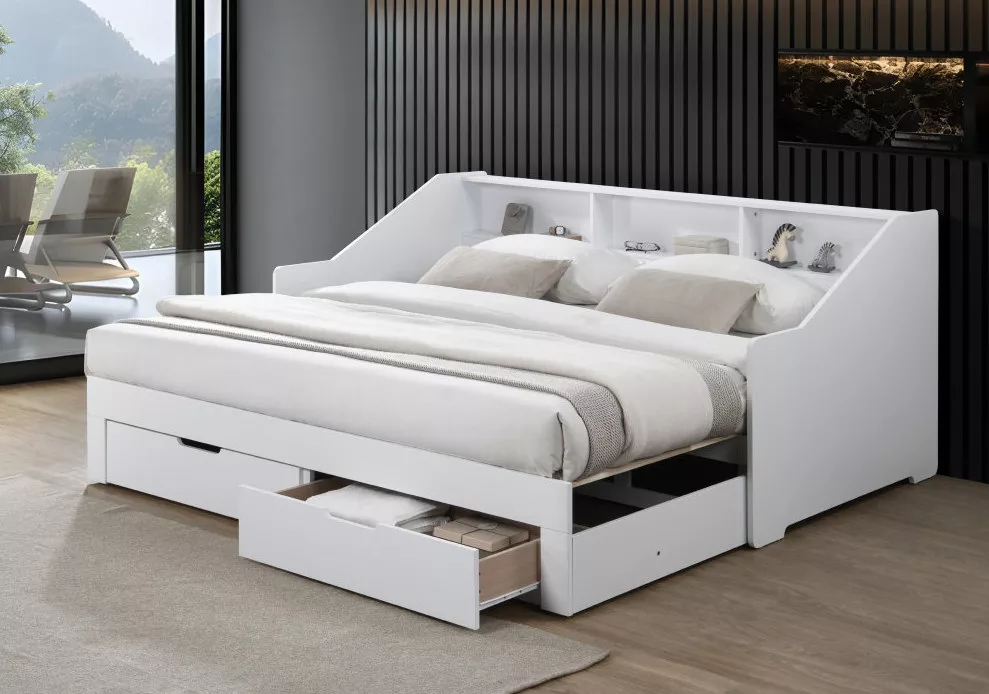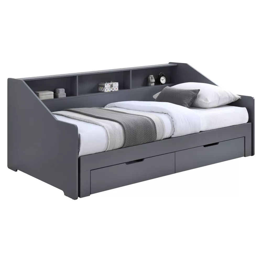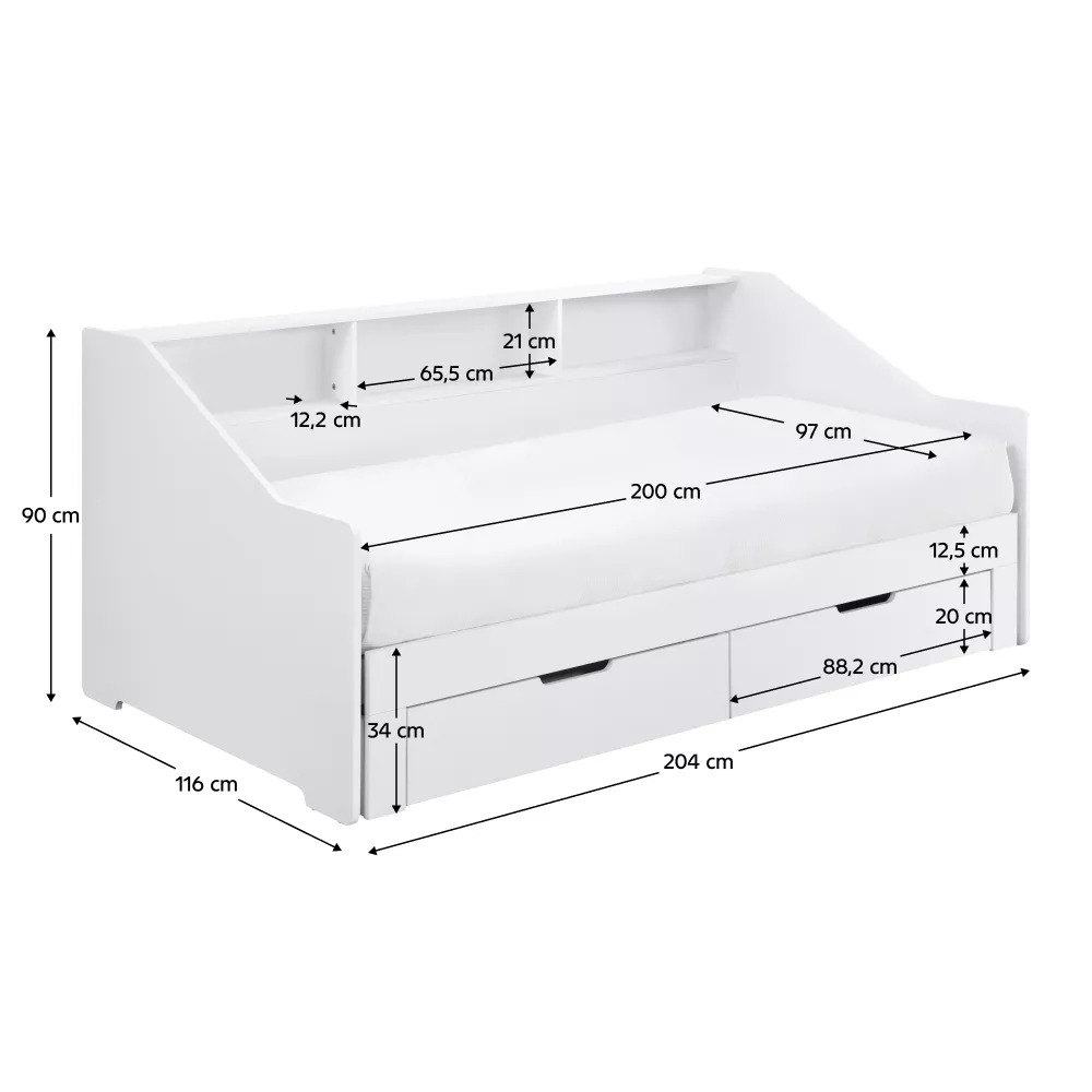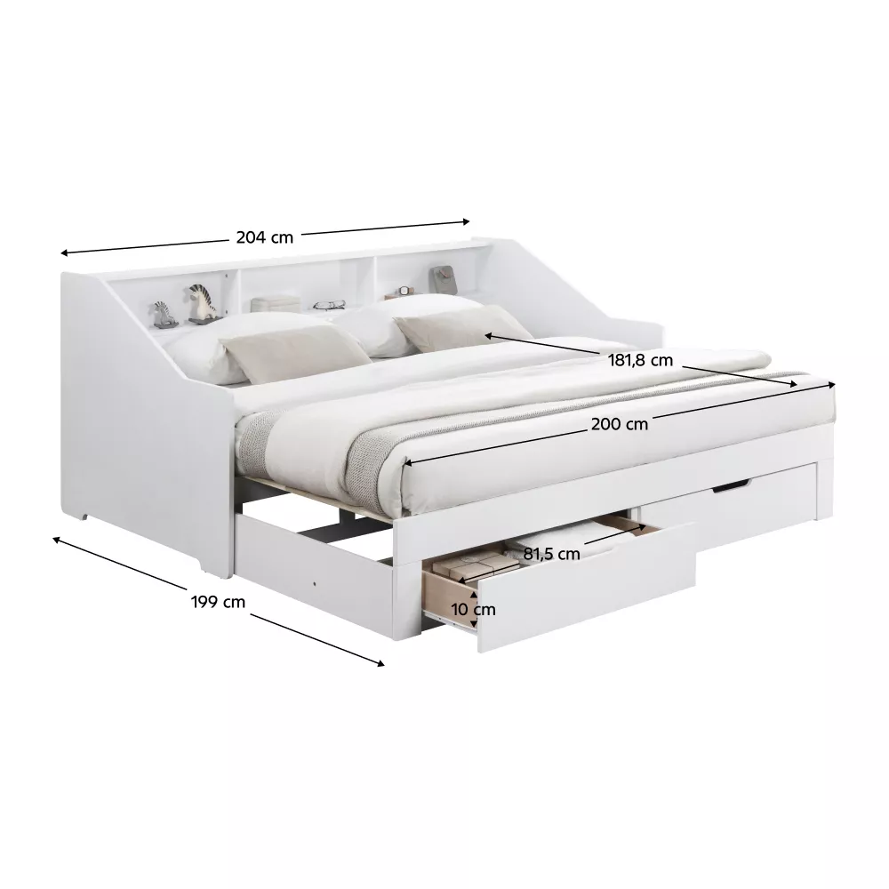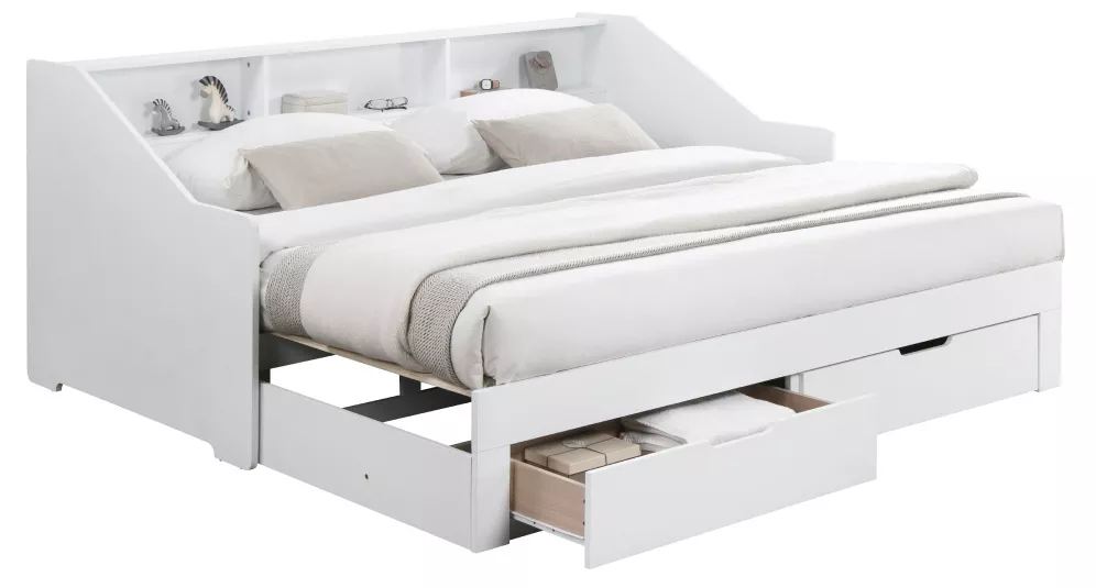Praktickou stránku doplňují dvě zásuvky, které poskytují úložný prostor pro lůžkoviny, oblečení nebo hračky. Vyvýšená bočnice zároveň chrání stěnu a obsahuje tři otevřené police, ideální na knížky, dekorace nebo drobnosti, které chcete mít po ruce.