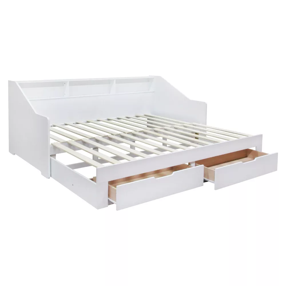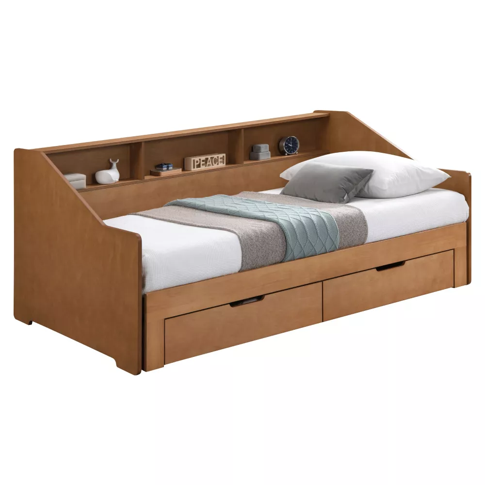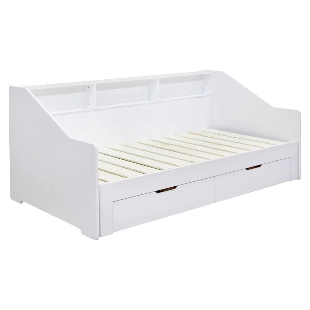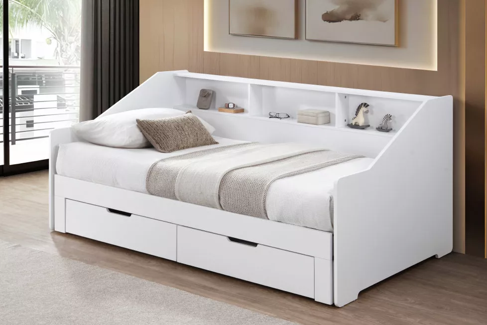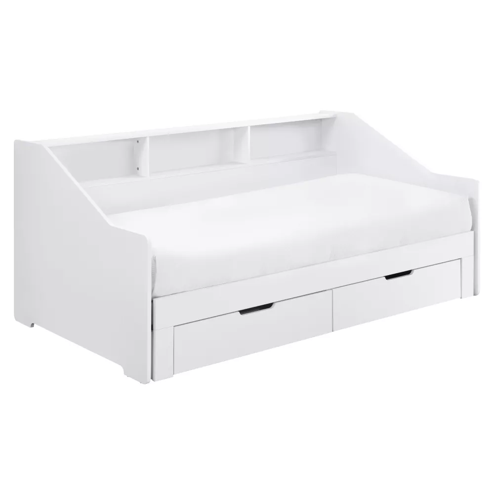 Praktickou stránku doplňují dvě zásuvky, které poskytují úložný prostor pro lůžkoviny, oblečení nebo hračky. Vyvýšená bočnice zároveň chrání stěnu a obsahuje tři otevřené police, ideální na knížky, dekorace nebo drobnosti, které chcete mít po ruce.