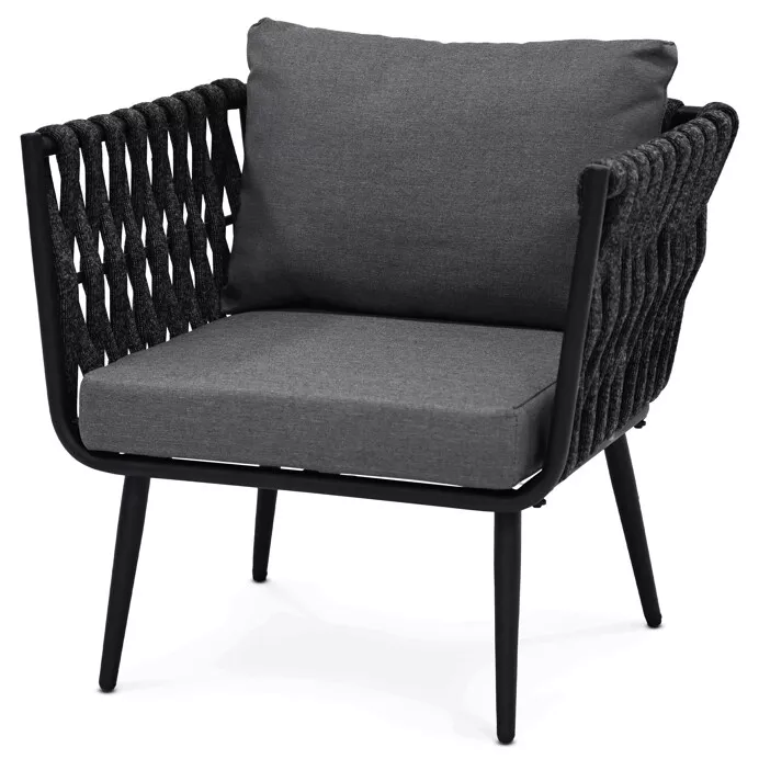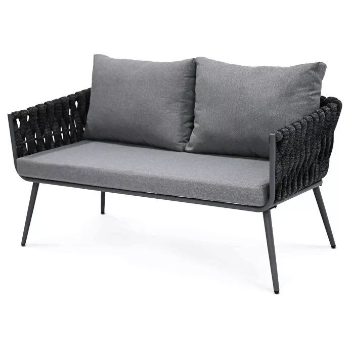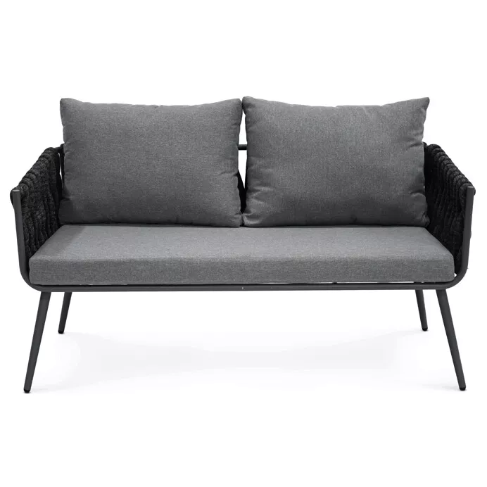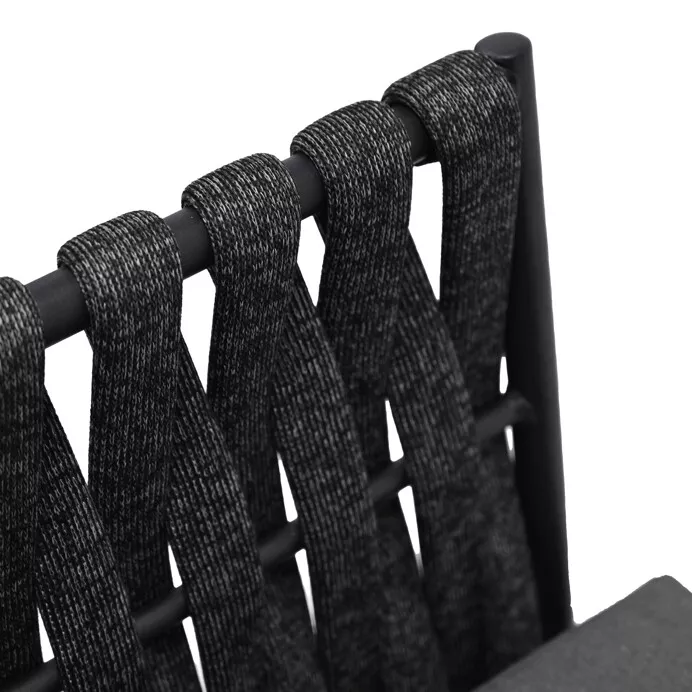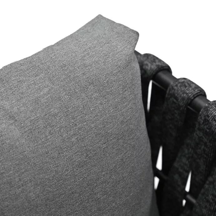 Sedací část je tvořena robustními rámy s výrazným opletením širokým textilním pruhem, který dodává celému setu originální vzhled a zároveň zachovává vzdušnost. Pohodlné polstrování v šedé barvě zajišťuje příjemné sezení i při delším odpočinku a je přizpůsobeno venkovním podmínkám.