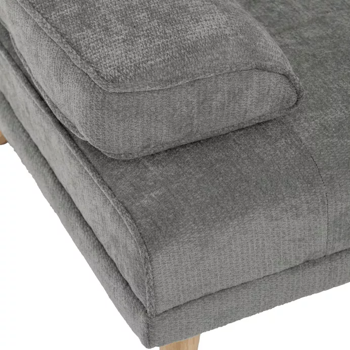 Pohovka je čalouněná šedou prémiovou látkou, která je příjemná na dotek a vhodná pro každodenní používání. Stabilitu a dlouhou životnost zajišťuje pevná konstrukce z masivního kaučukovníku. Elegantní dřevěné nohy v přírodním odstínu dodávají pohovce moderní a nadčasový vzhled.