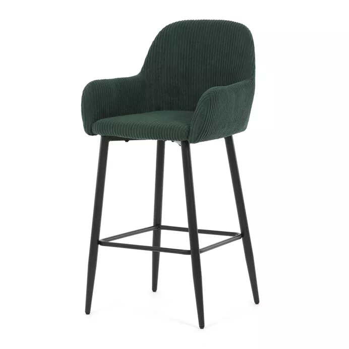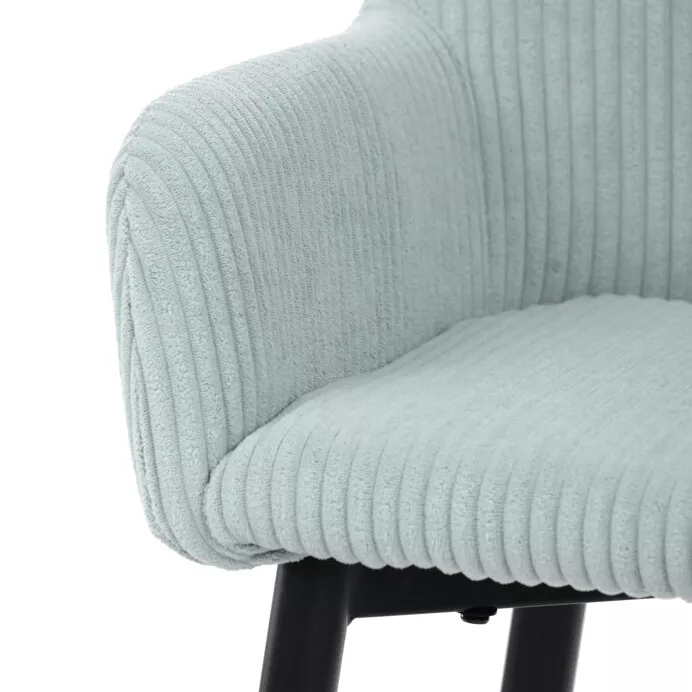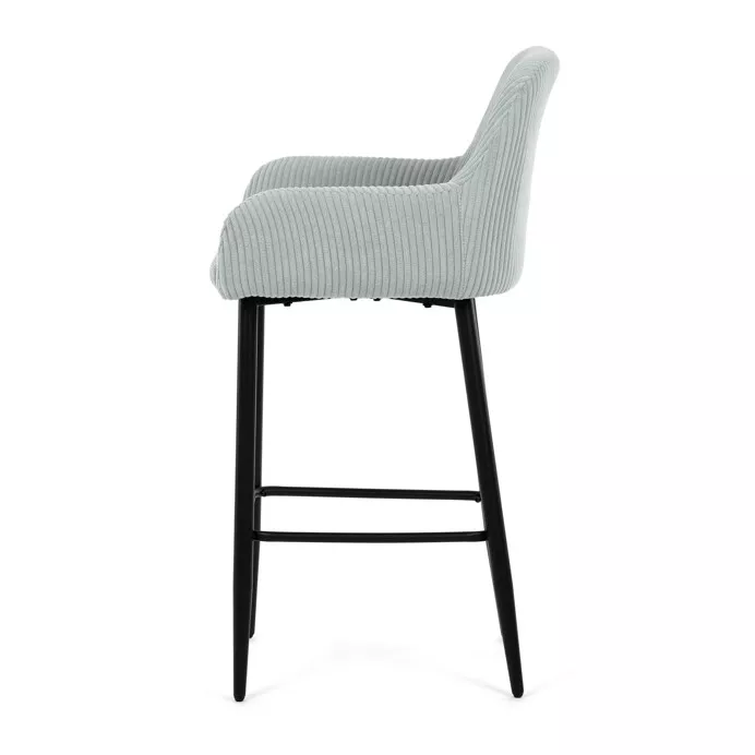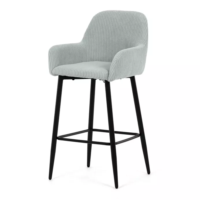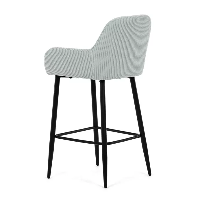 Barová židle AUB-V4009 je stylovým a pohodlným doplňkem k barovému pultu i kuchyňskému ostrůvku. Manšestrový potah dodává židli příjemnou strukturu, elegantní vzhled a zároveň zajišťuje komfort při každodenním používání. Díky kombinaci modré látky a černých kovových nohou působí moderně, ale snadno zapadne i do klasičtěji laděných interiérů.