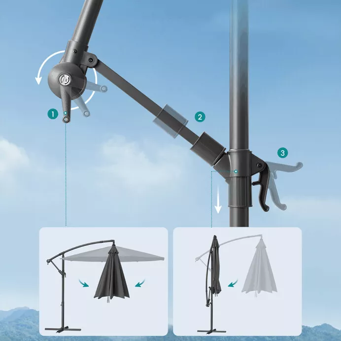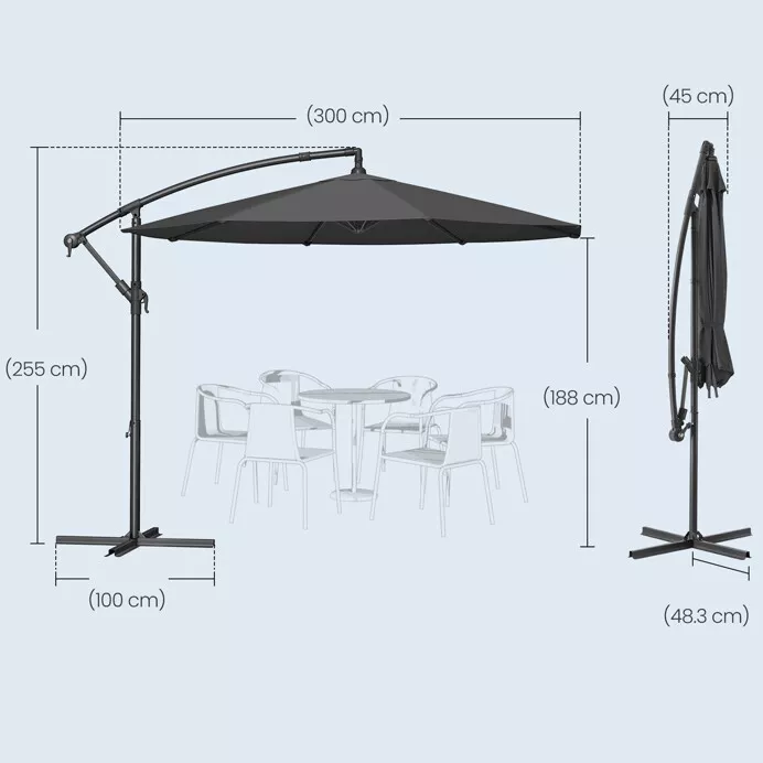 Zahradní závěsný slunečník ASL-E1116 v moderním šedém provedení je praktickým a stylovým řešením pro vytvoření příjemného stínu na terase, zahradě i u bazénu. Díky velkorysé stínící ploše poskytuje dostatek ochrany při rodinném stolování, odpočinku i posezení s přáteli během horkých letních dnů.