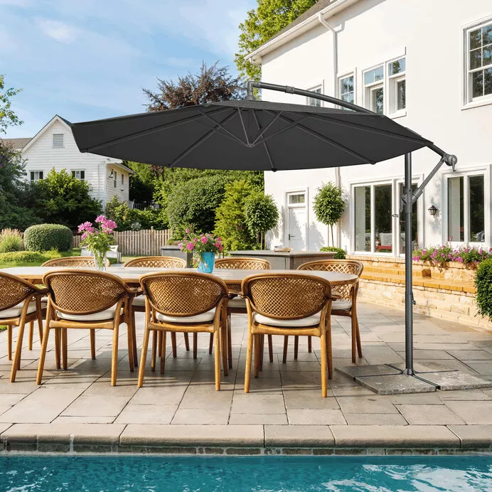 Zahradní závěsný slunečník je ideální volbou pro každého, kdo hledá funkční stínění s moderním vzhledem a dostatečně velkou plochou pro pohodlné letní posezení.