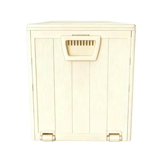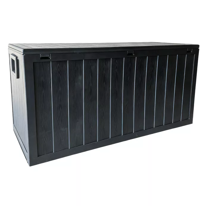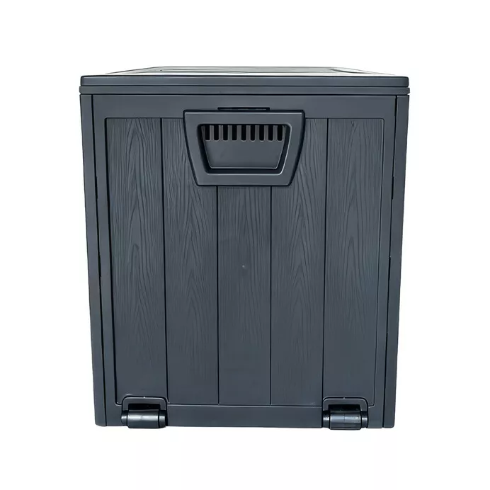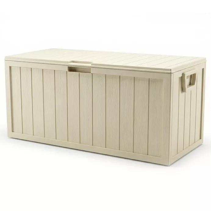 Box je vyroben z pevného plastu, který je odolný vůči běžným povětrnostním vlivům a zároveň nenáročný na údržbu. Povrch má texturu imitující dřevo, takže box působí přirozeně a dobře zapadne do zahradního prostředí. Víko je vybaveno integrovaným úchytem pro snadné otevírání a boční madla umožňují pohodlné přenášení.