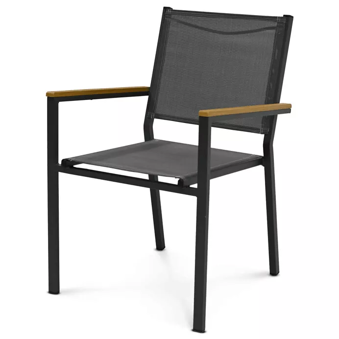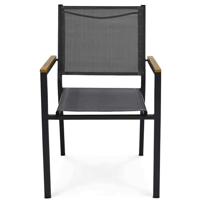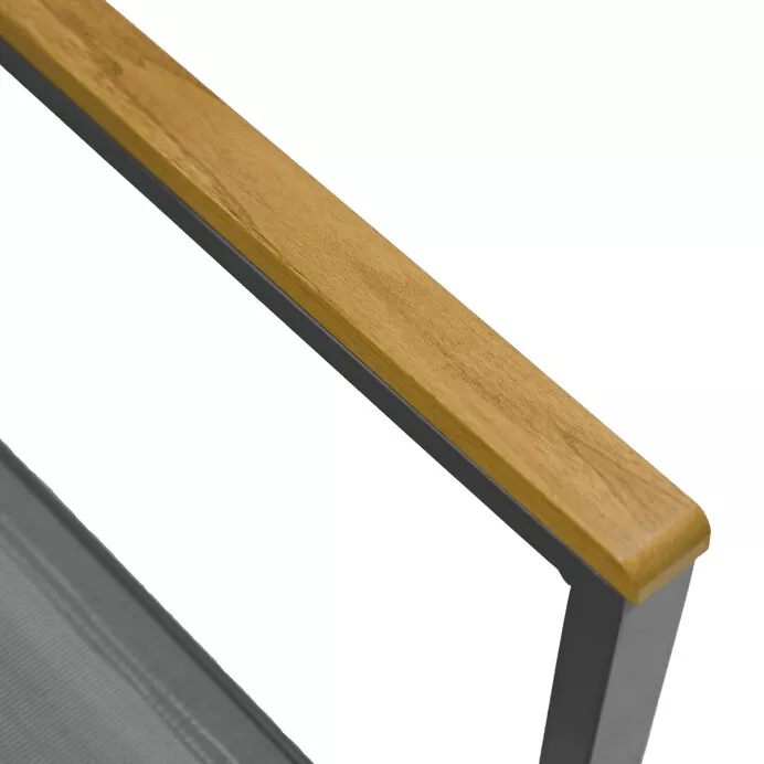 Sedák i opěradlo jsou vyrobeny z odolné síťoviny, která je příjemná na sezení, dobře větrá a snadno se udržuje. Stabilní kovový rám v šedé barvě zajišťuje pevnost a dlouhou životnost i při pravidelném venkovním používání. Područky z polywoodu zvyšují komfort a zároveň židli dodávají přirozenější vzhled.
