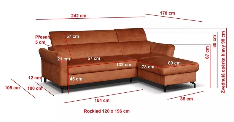 Velkým plusem jsou polohovatelné opěrky hlavy - snadno si nastavíte ideální pozici pro relax, čtení nebo sledování televize. Kovové černé nohy o výšce 12 cm dodávají sedačce lehký, moderní vzhled a zároveň usnadní úklid pod sedačkou.