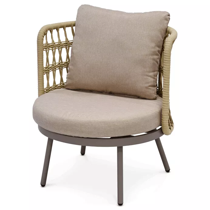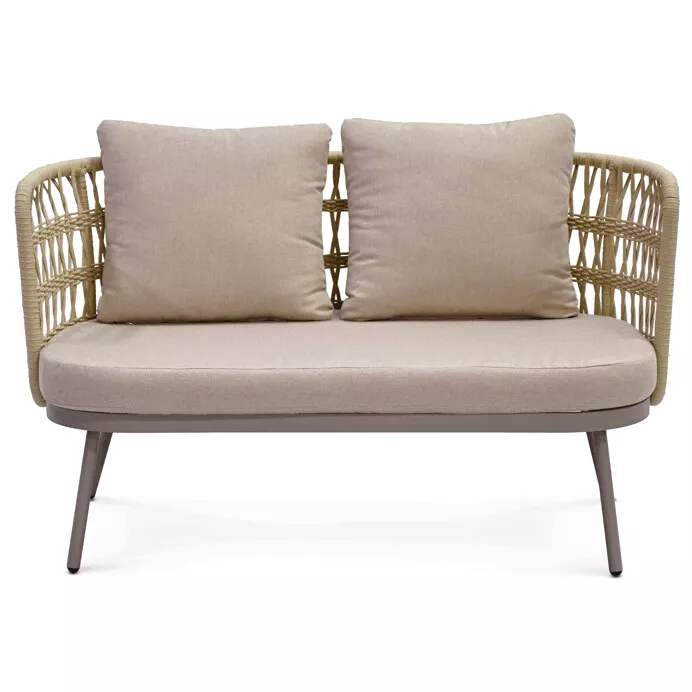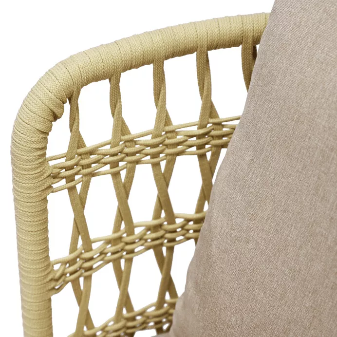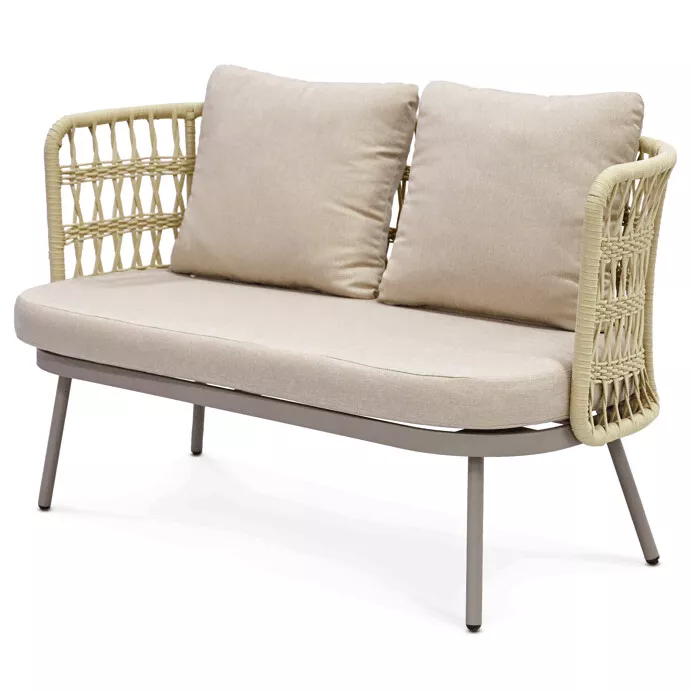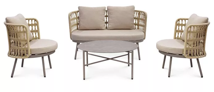 Set tvoří dvě křesla, prostorná lavice a praktický stolek. Sedací části jsou vybaveny měkkými polštáři s látkovým potahem, který je příjemný na dotek a vhodný pro venkovní použití. Otevřená struktura opěradel dodává nábytku lehkost a podporuje celkový komfort při sezení.