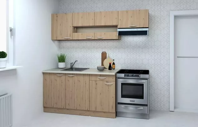Kuchyně Nela zaujme svou jednoduchostí a čistými liniemi, které vytvářejí moderní a elegantní vzhled. Hladké přední plochy z laminované dřevotřískové desky v dřevodekoru doplňuje stylová úchytka a netradiční dvířka se skleněnou výplní u vybraných skříněk. Výsledkem je vkusná a nadčasová kuchyňská sestava vhodná do každého prostoru.